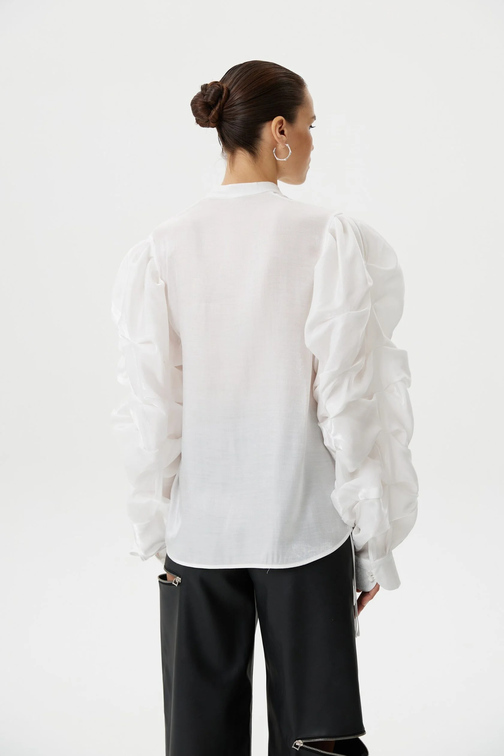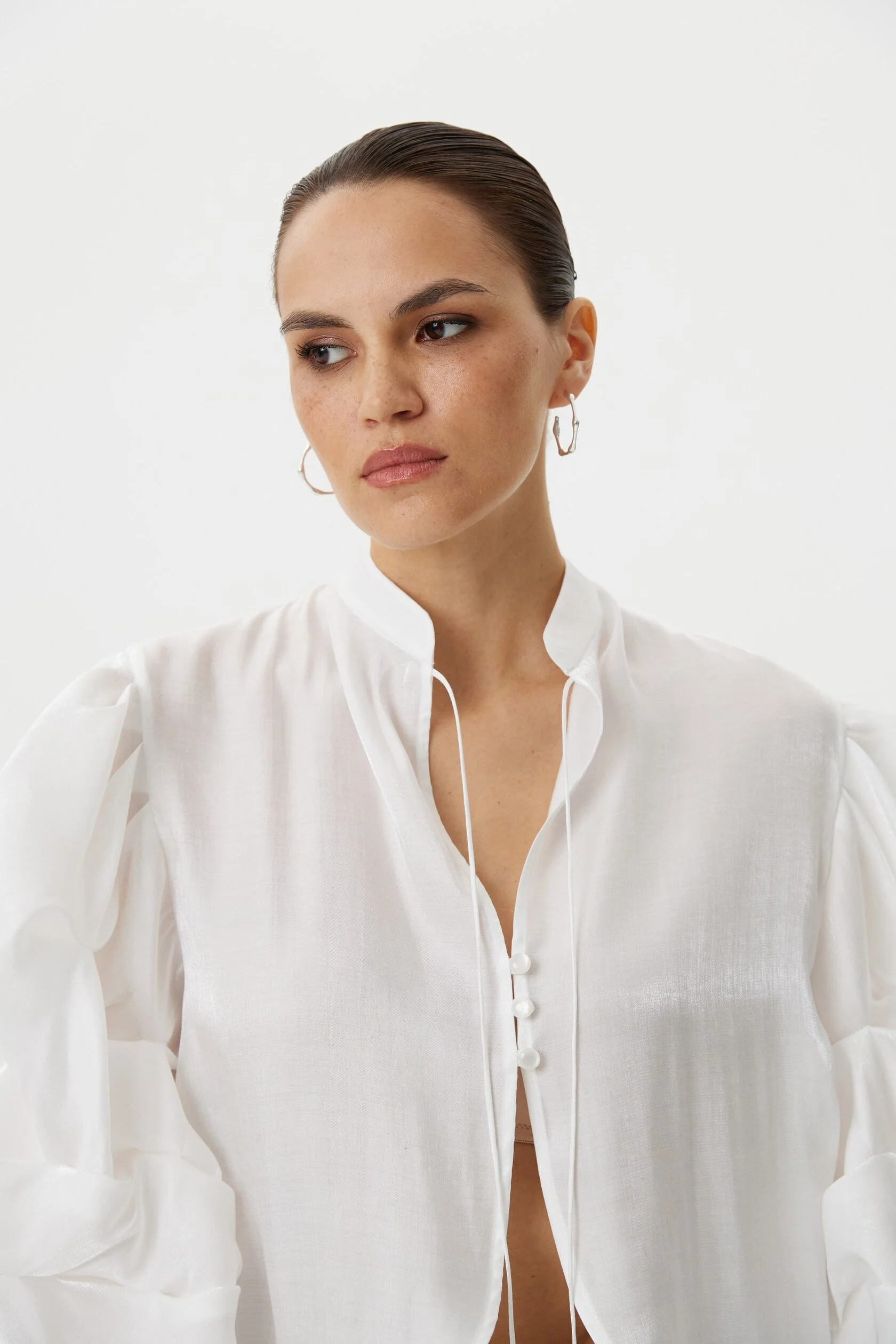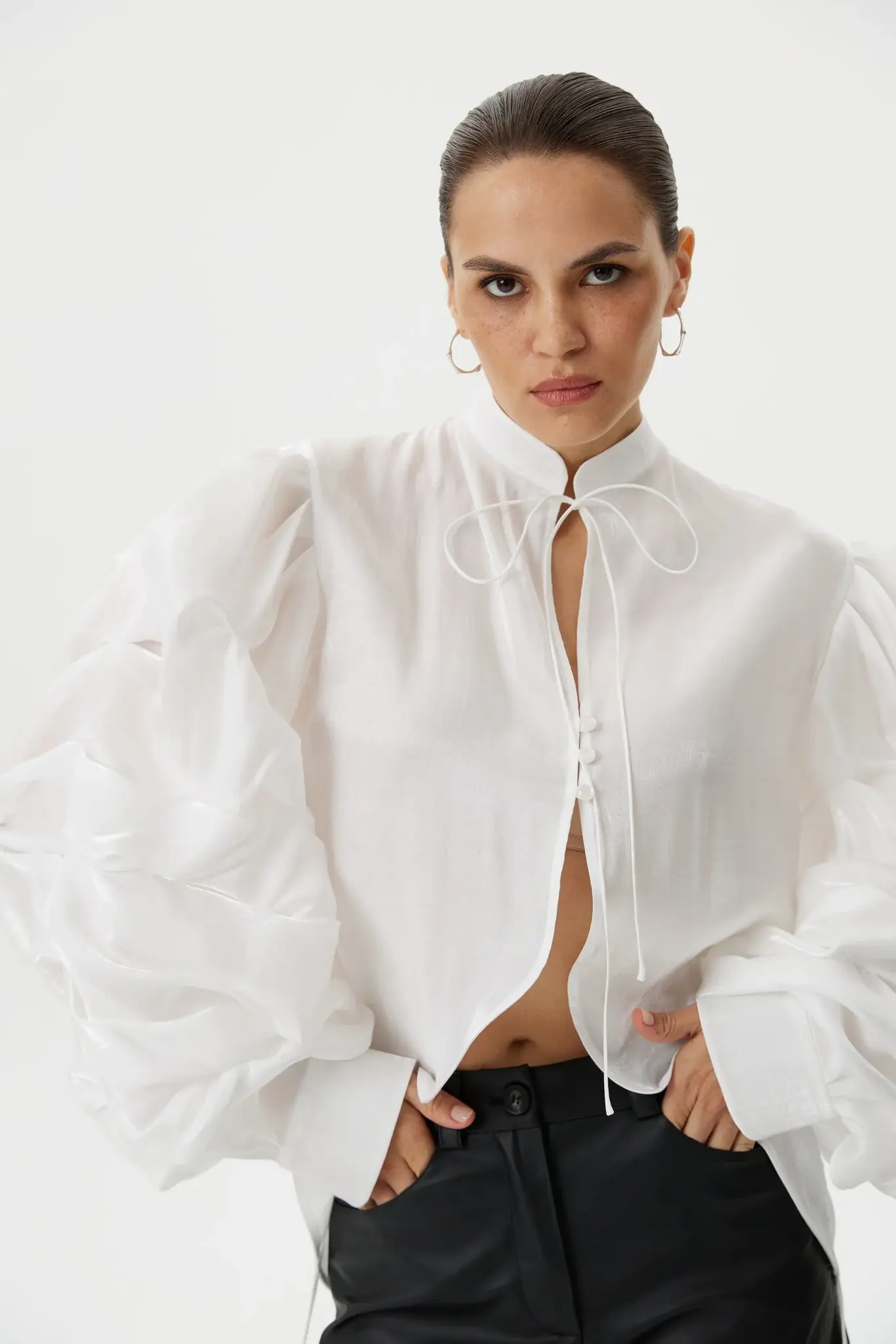 Гипертрофированно увеличенный объем рукавов с защипами создает эффект "воздушности". Чтобы усилить его, мы закруглили низ изделия, укоротив его спереди. Минималистичная застежка на три пуговицы и завязка на аккуратной стойке добавляет образу легкости.