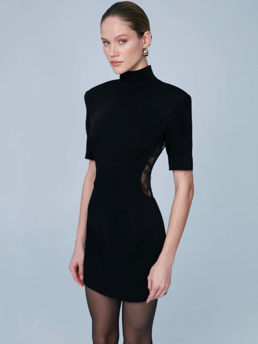 Платье Enigma Black — лаконичное мини с архитектурным силуэтом и утончённой чувственностью в деталях. Чистые линии, высокая стойка и скульптурная посадка подчёркивают фигуру, а изящные кружевные вставки по бокам создают эффект лёгкой интриги и глубины. Сдержанный оттенок чёрного делает модель безупречной основой для вечерних выходов, камерных событий и особых случаев.