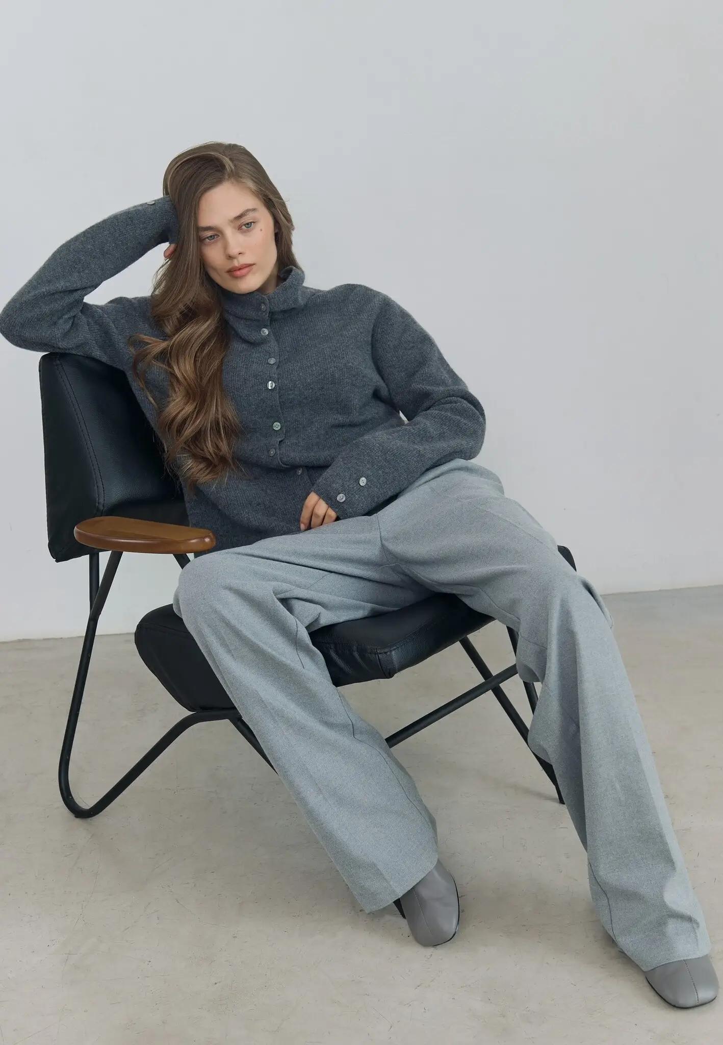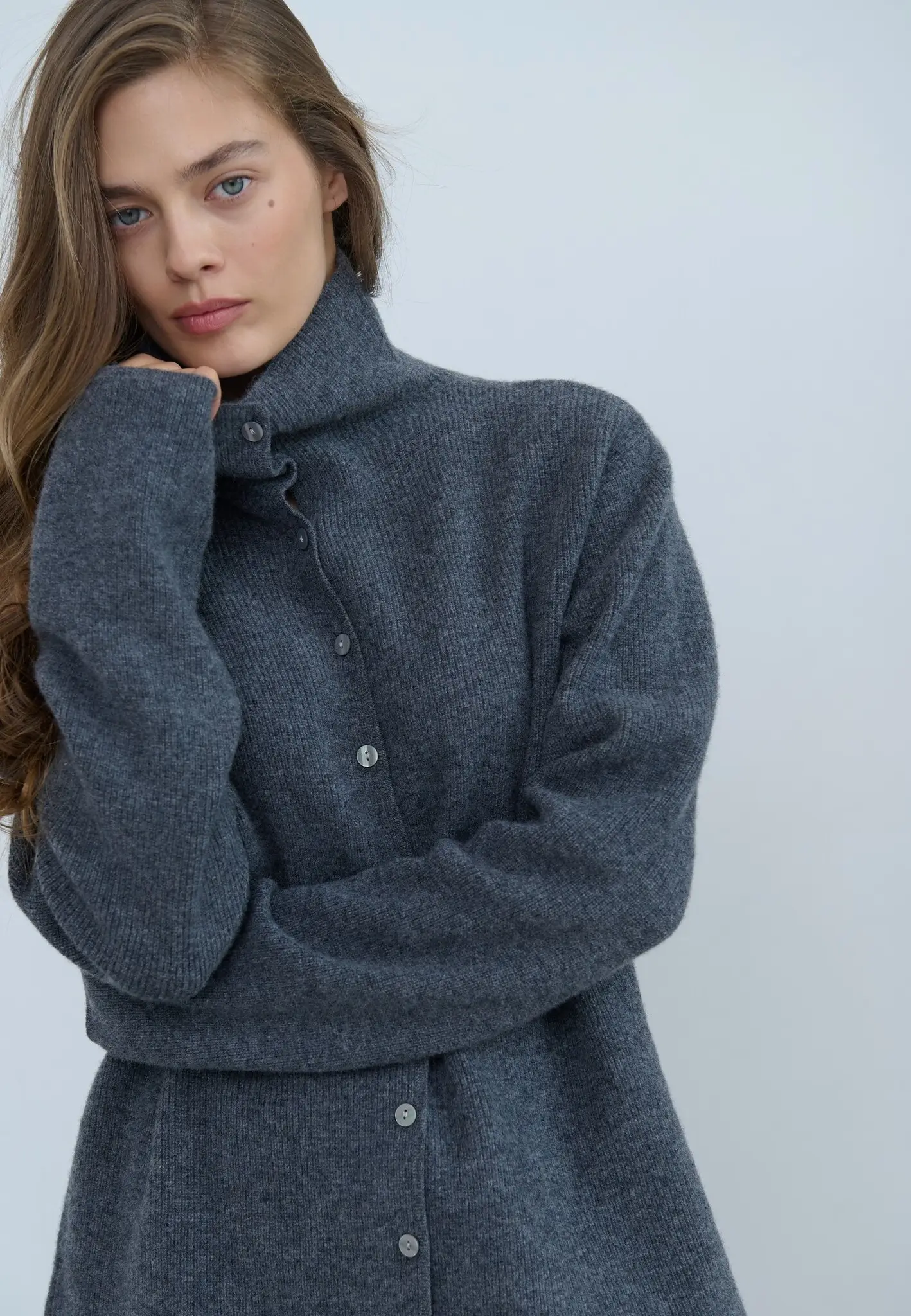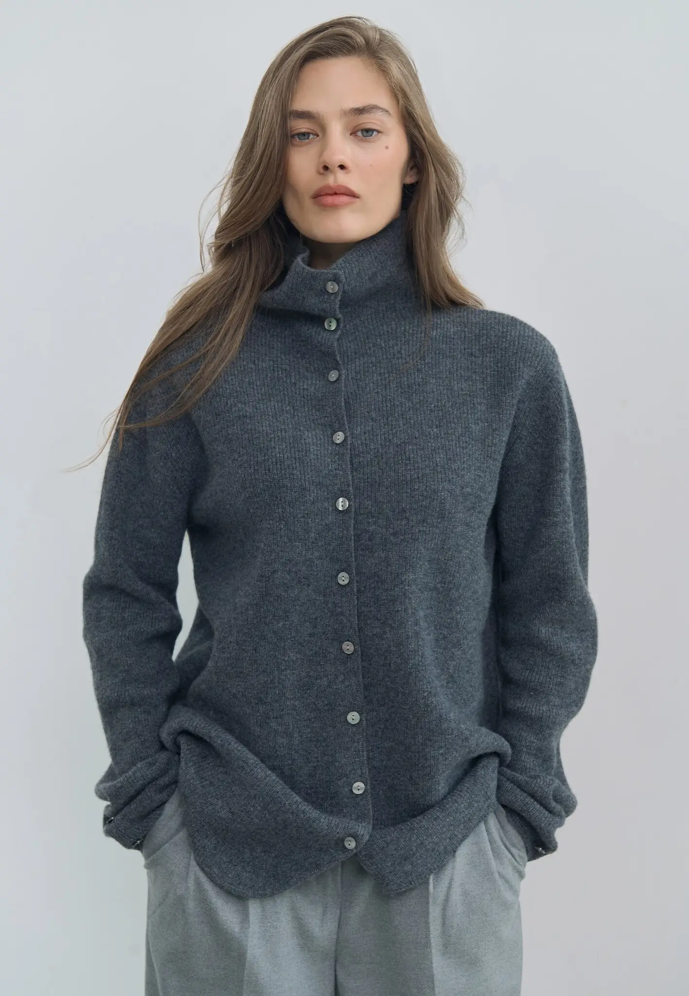 Мягкий, теплый и уютный кардиган станет любимым попутчиком в осенних прогулках. Модель с высоким горлом свободного объема на пуговицах дополнена ассиметричным краем.