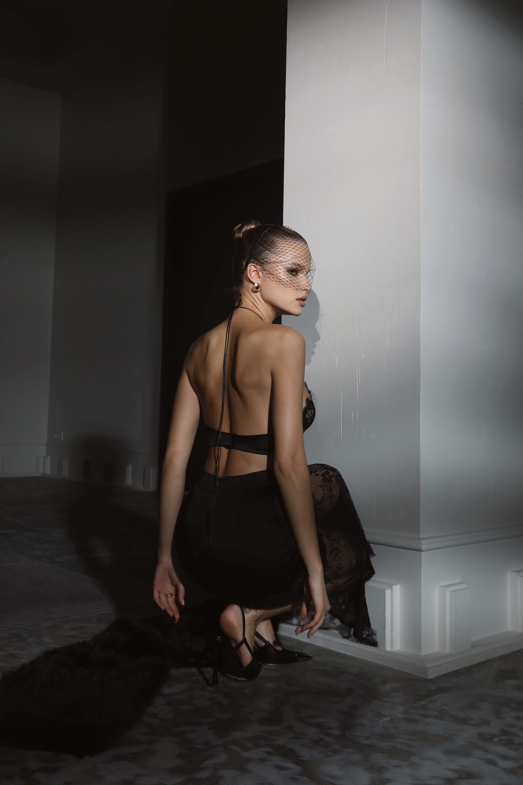 Юбка миди с акцентом на талию с плотным поясом из японского шелка и длинным кружевом.