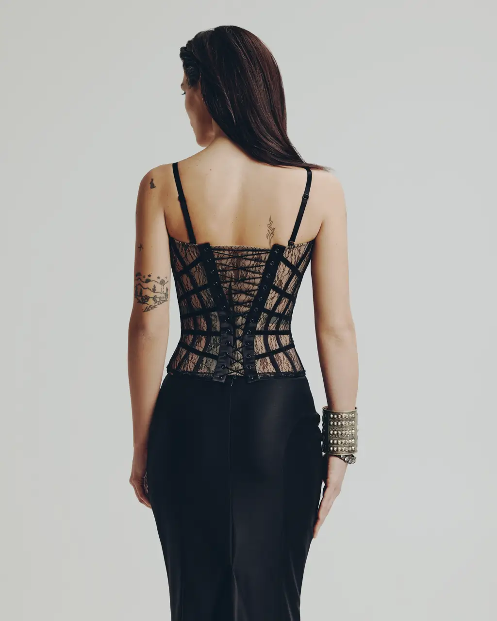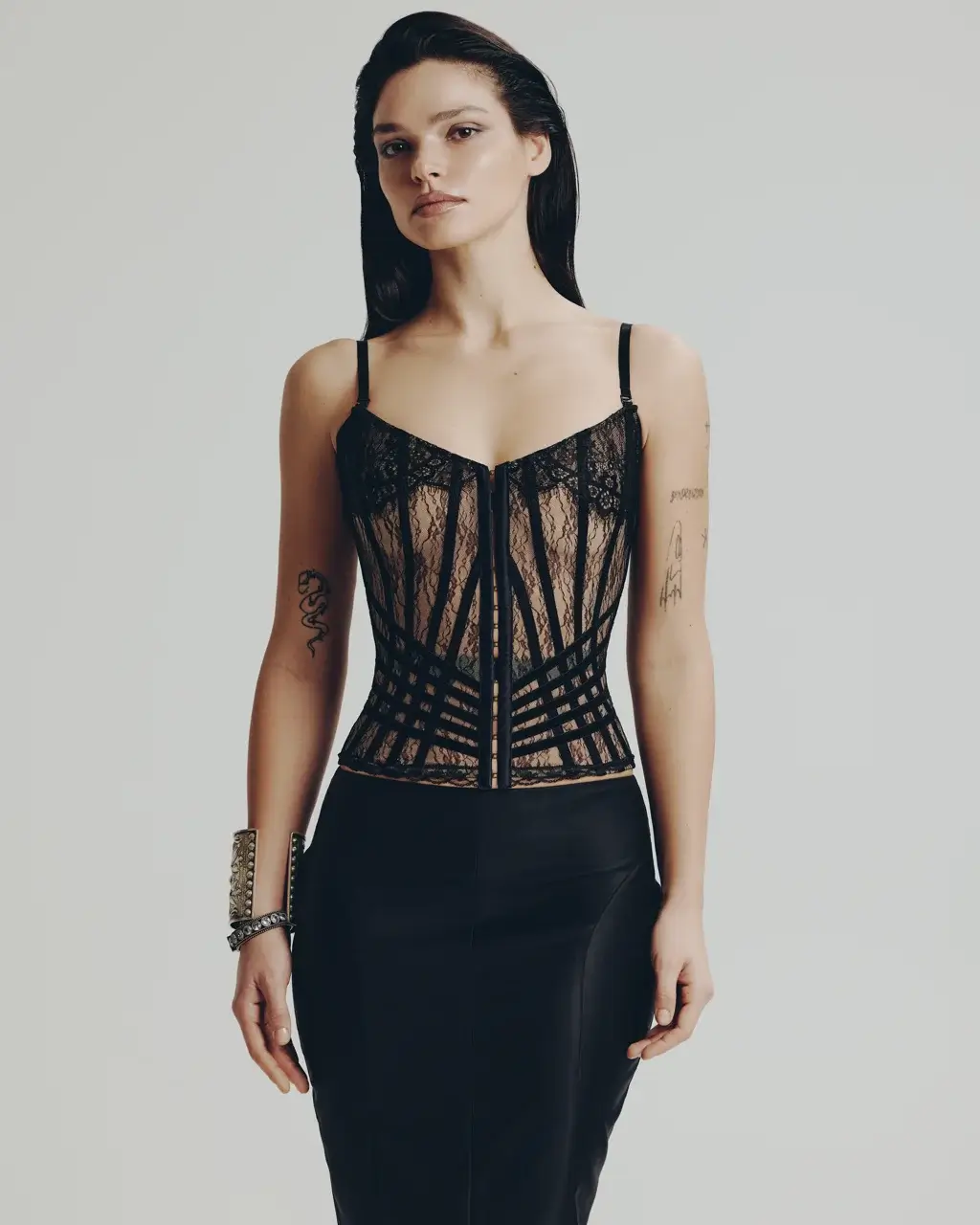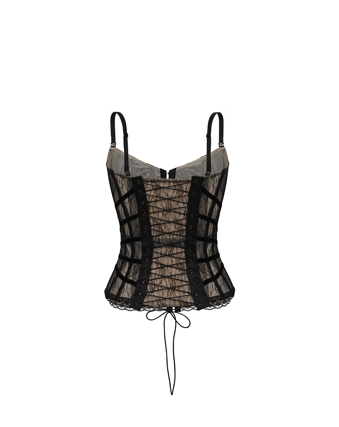 Корсет выполнен из нежного французского кружева и бархатных лент, которые вручную накалываются на манекене перед пошивом. Внутренний пояс позволяет скорректировать посадку деликатных материалов