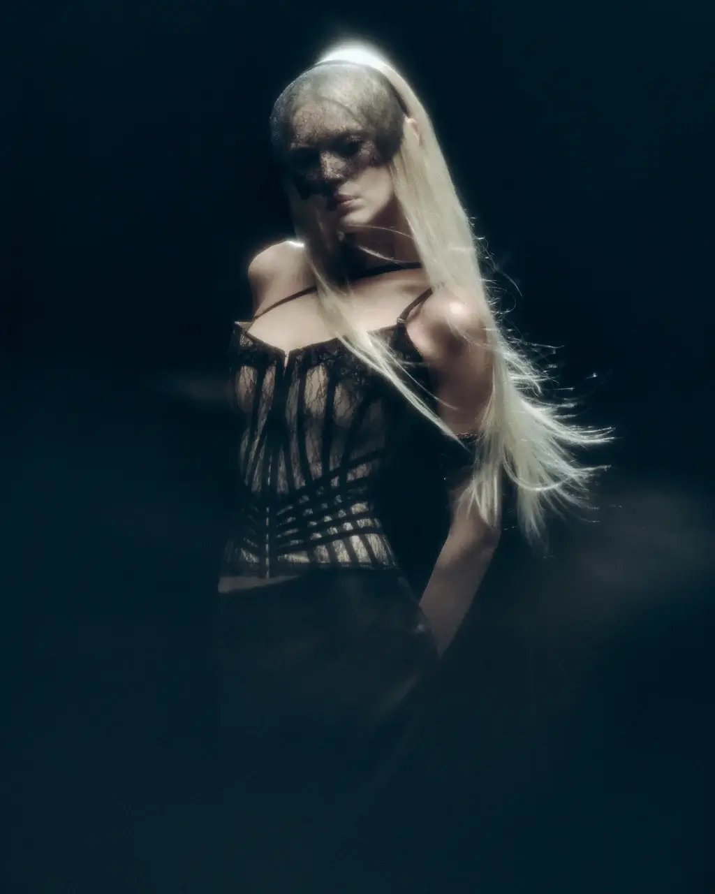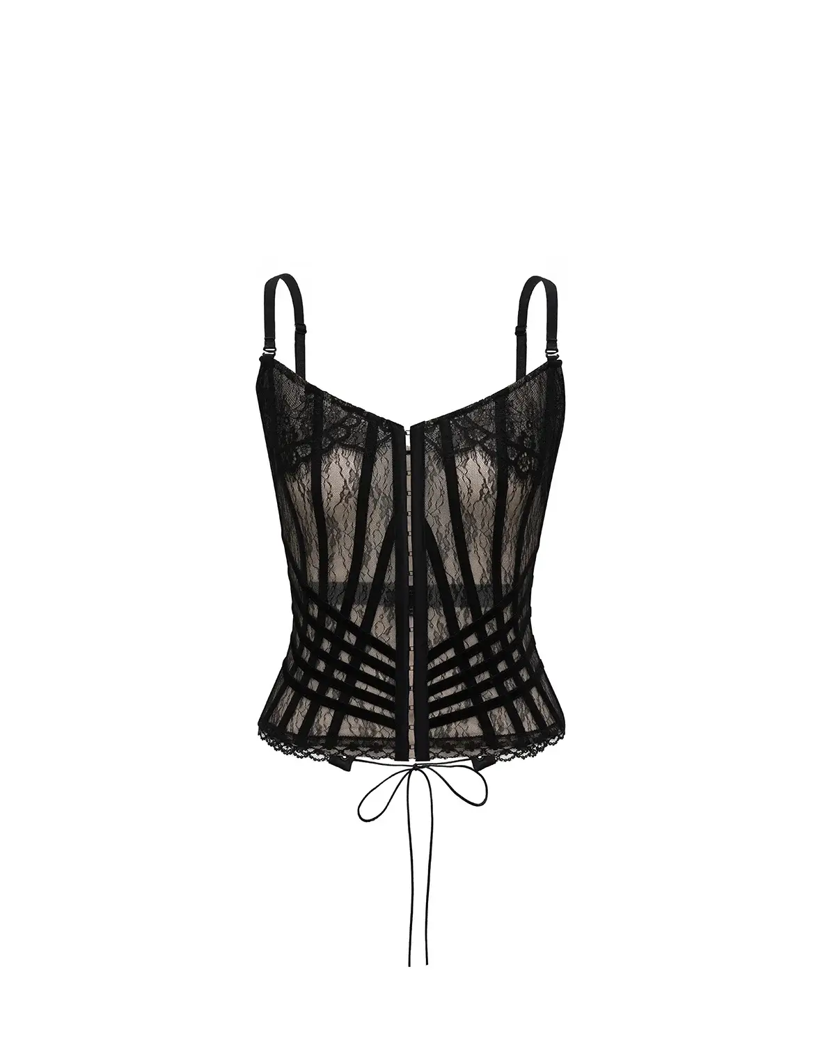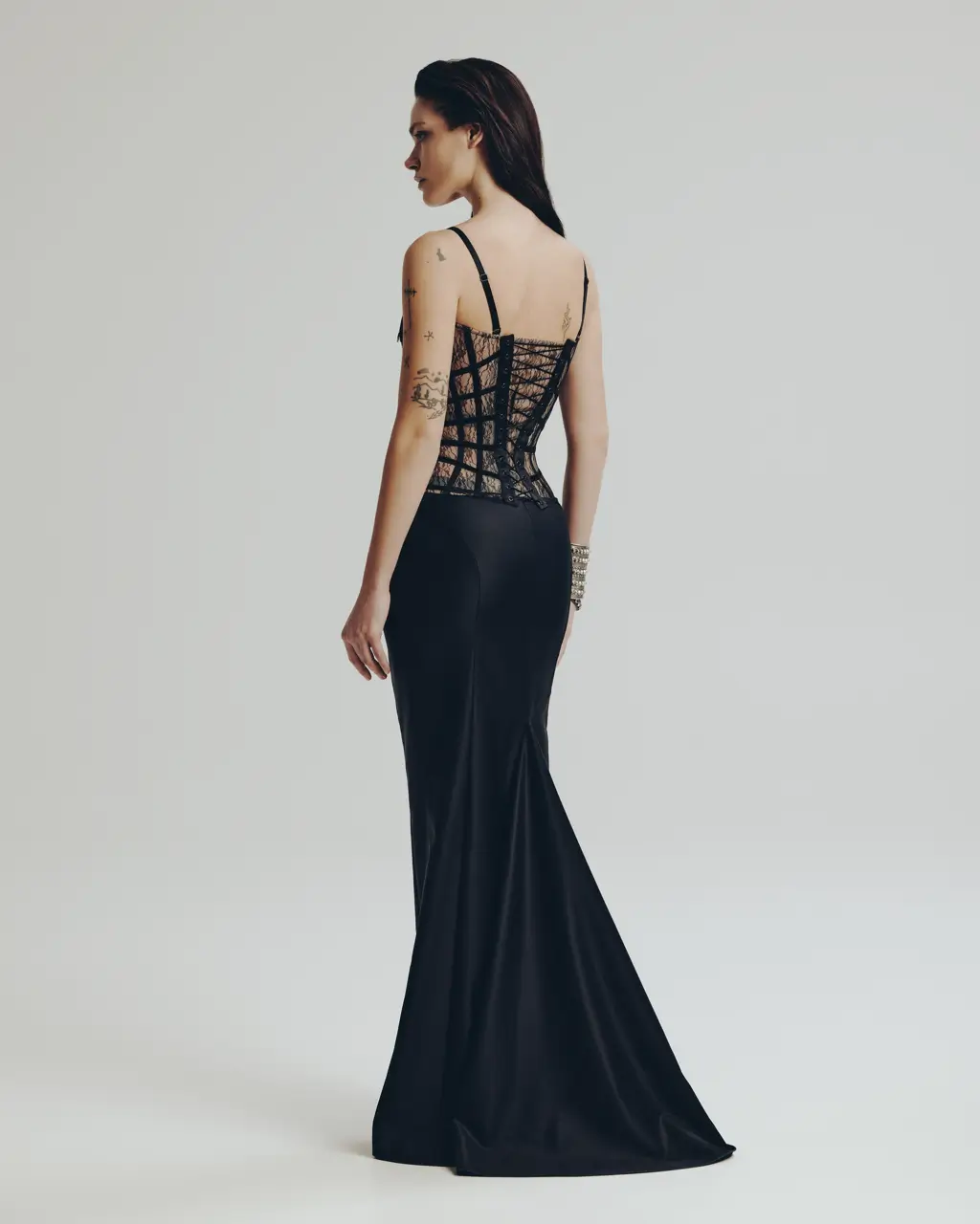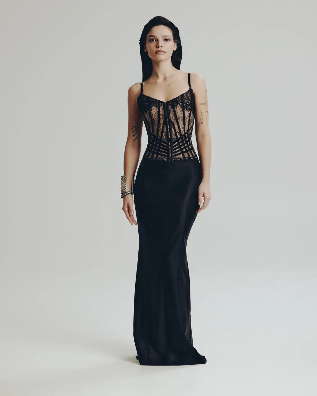 Корсет выполнен из нежного французского кружева и бархатных лент, которые вручную накалываются на манекене перед пошивом. Внутренний пояс позволяет скорректировать посадку деликатных материалов