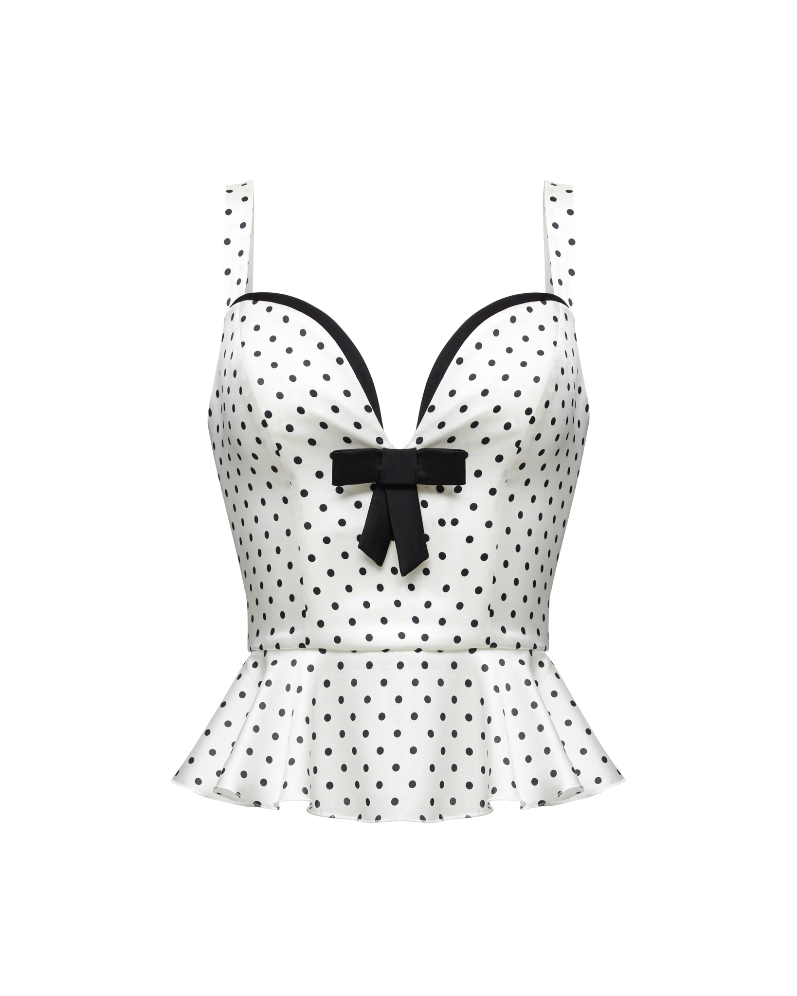 Модель облегающего кроя с широкими бретелями, трапециевидной баской, застежкой-молнией на спине, акцентным контуром по фигурному декольте и черным бантом на груди.