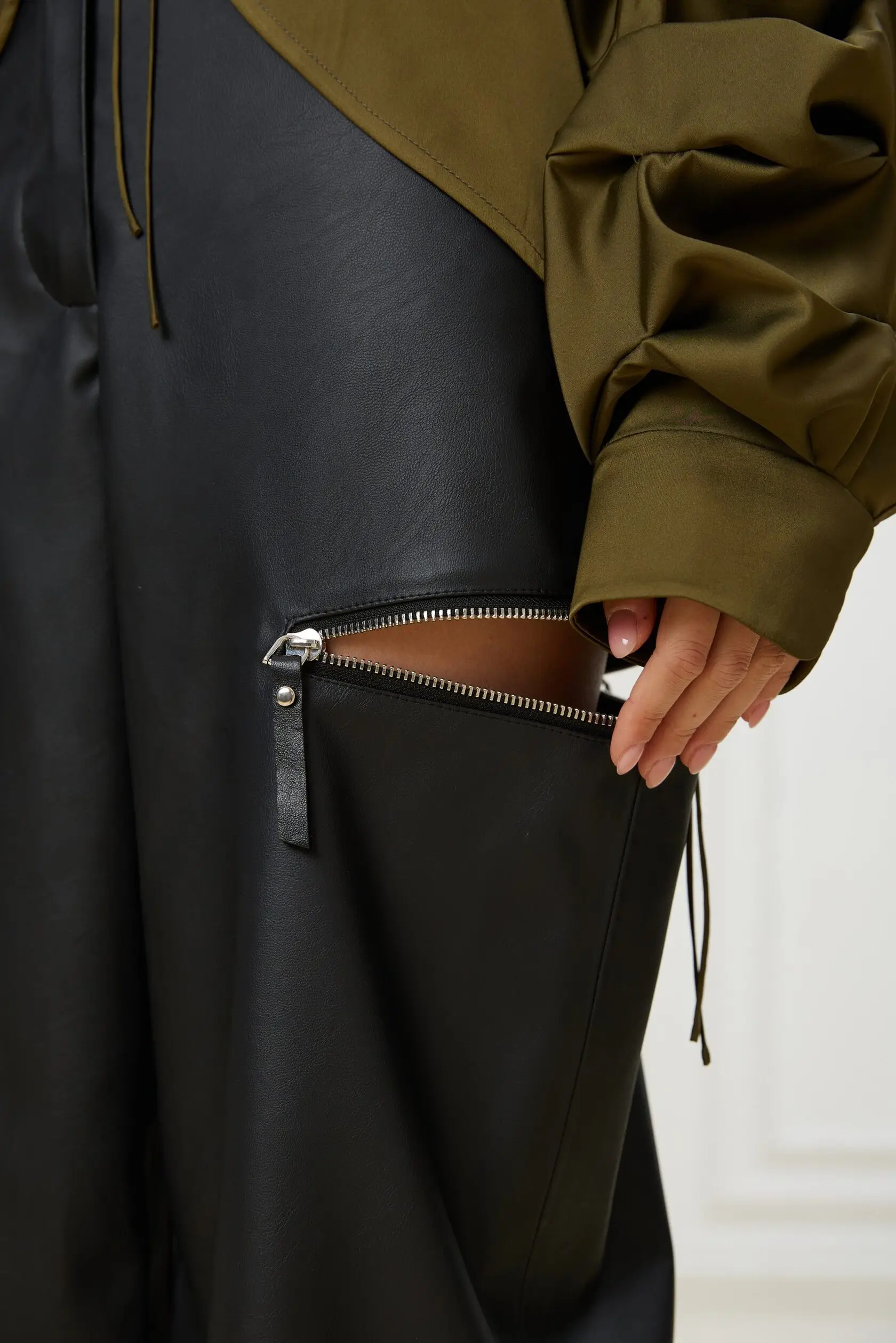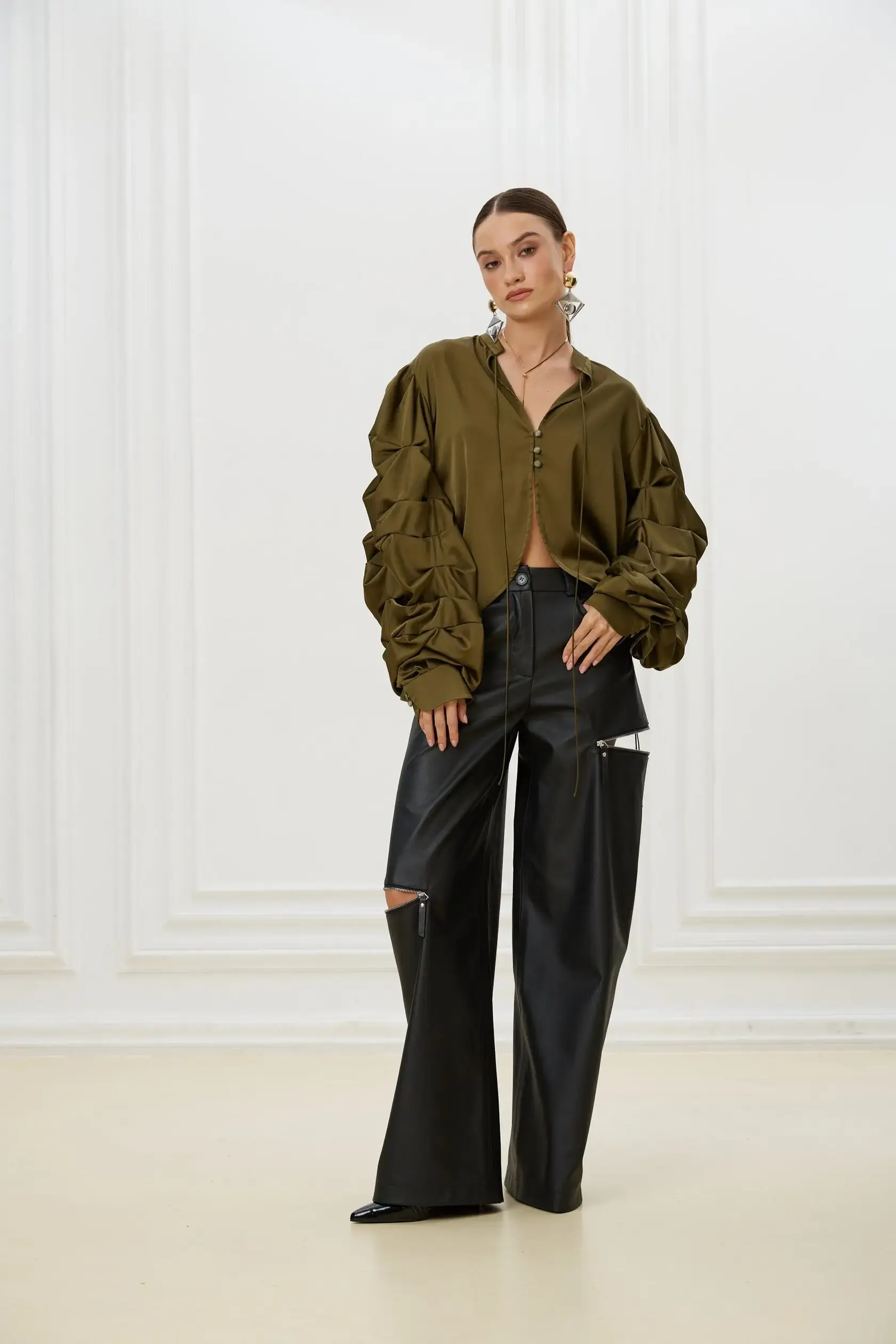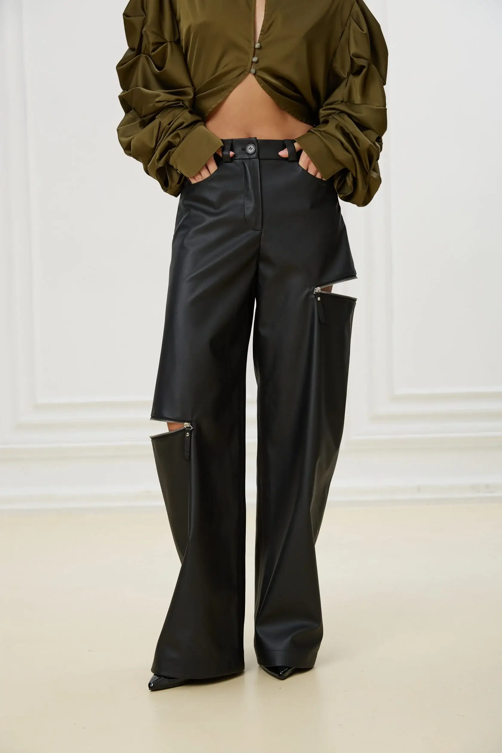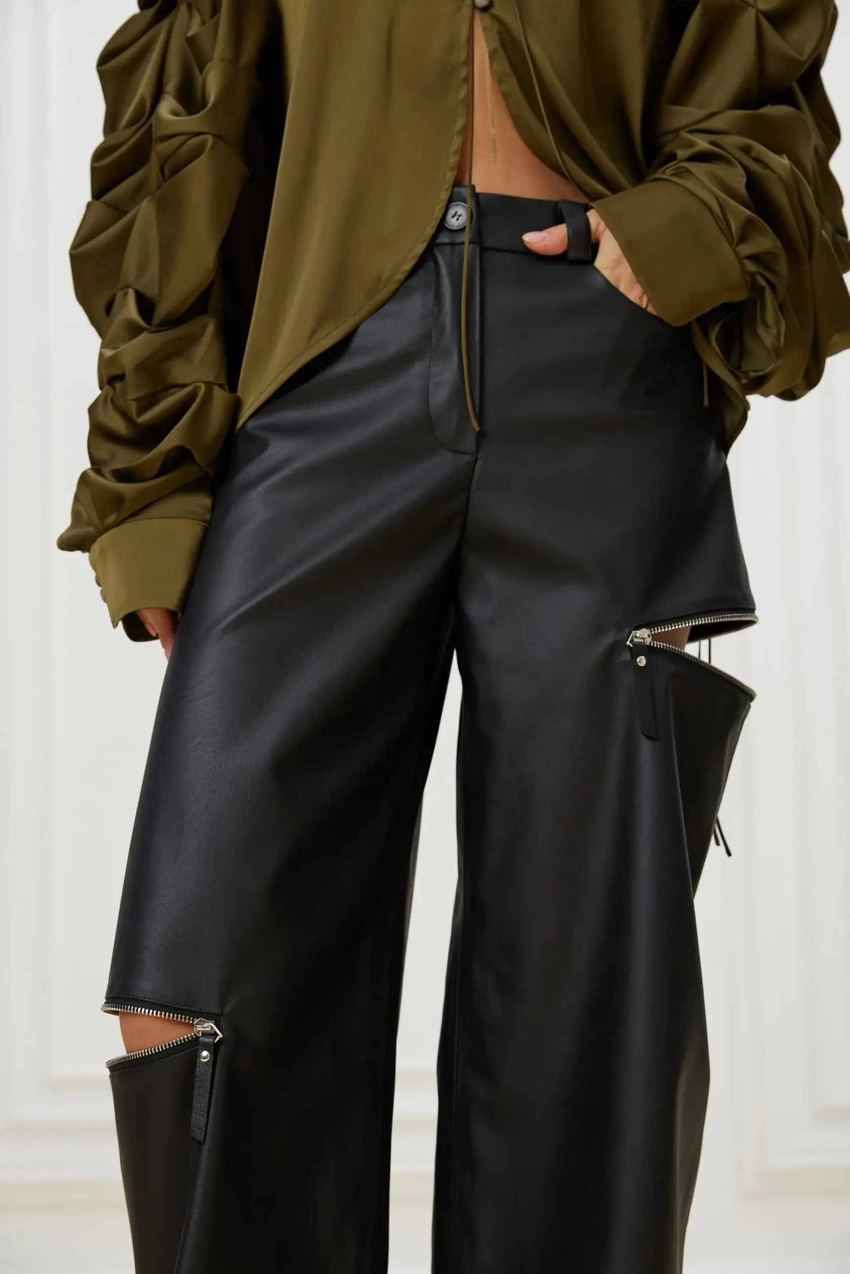 Широкие брюки из высококачественной эко-кожи, которая очень приятна на ощупь и не подвергается химической обработке, вредной для кожи.