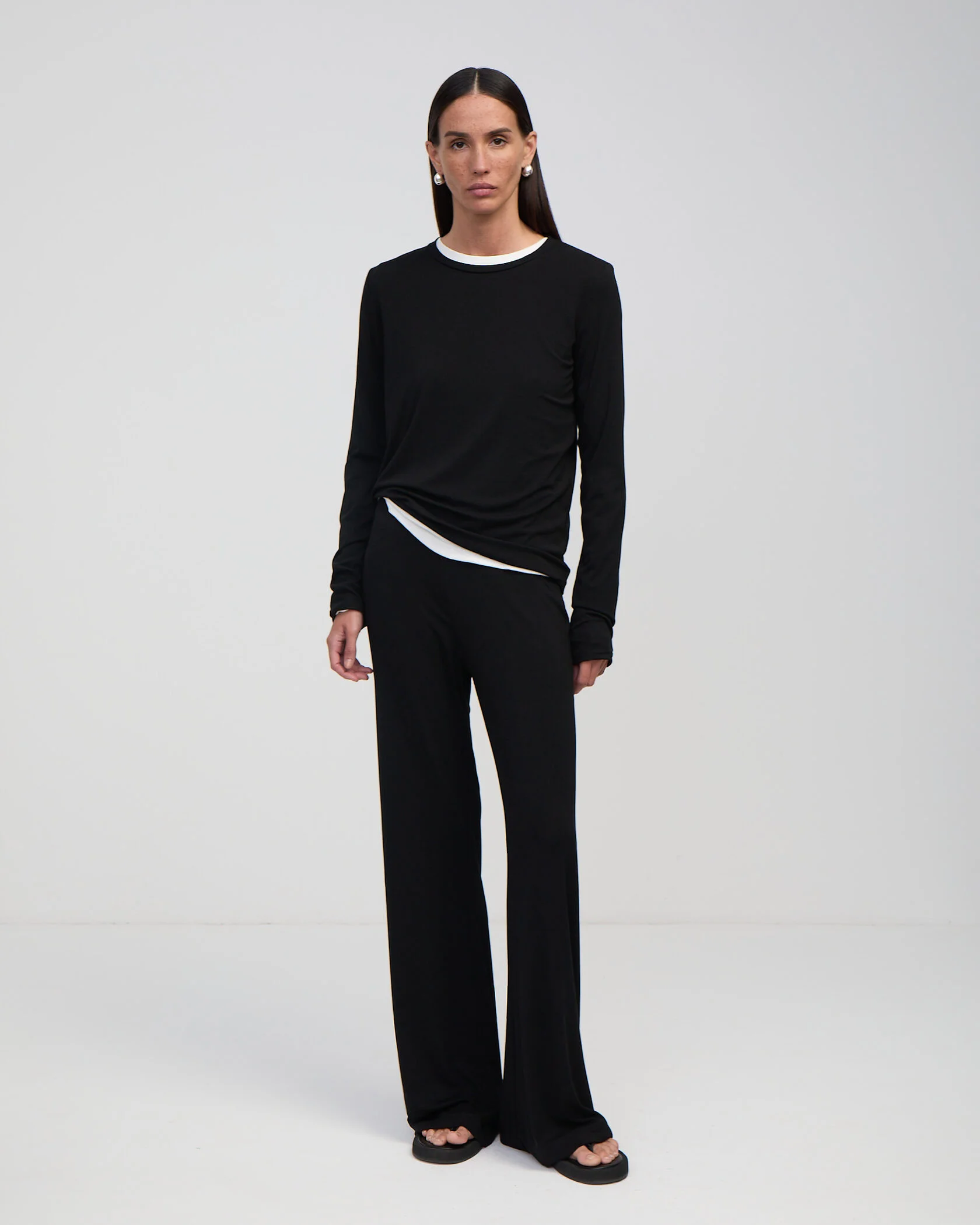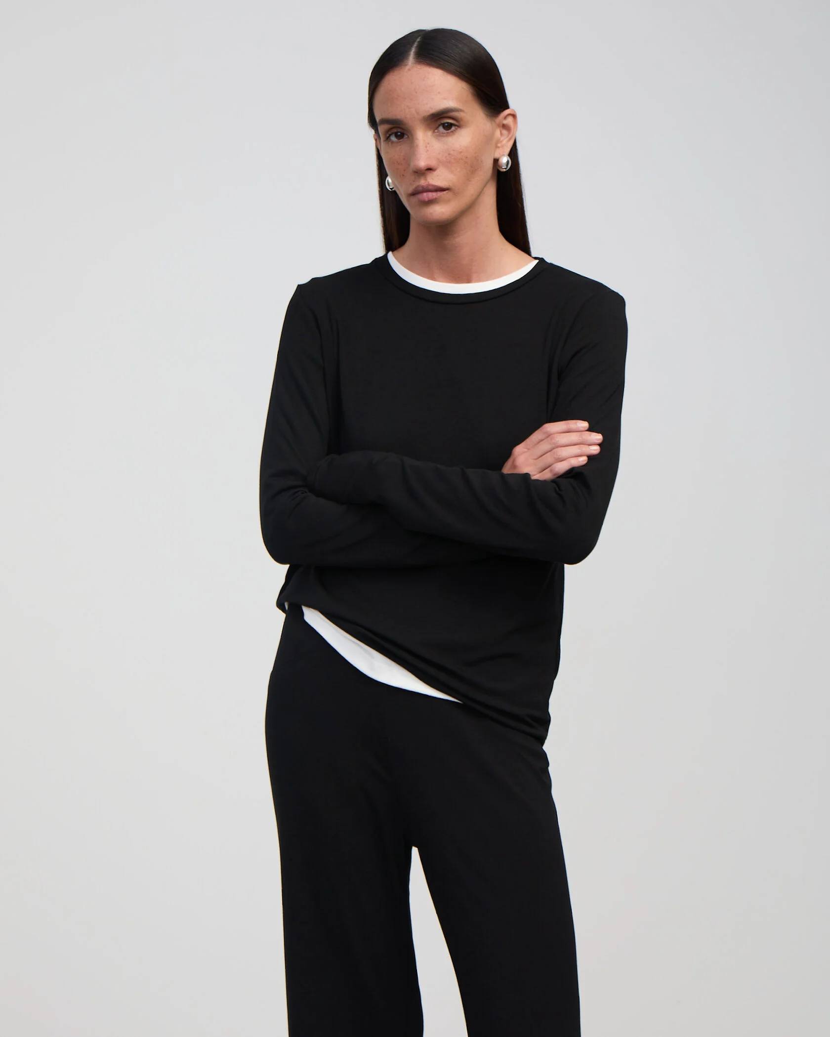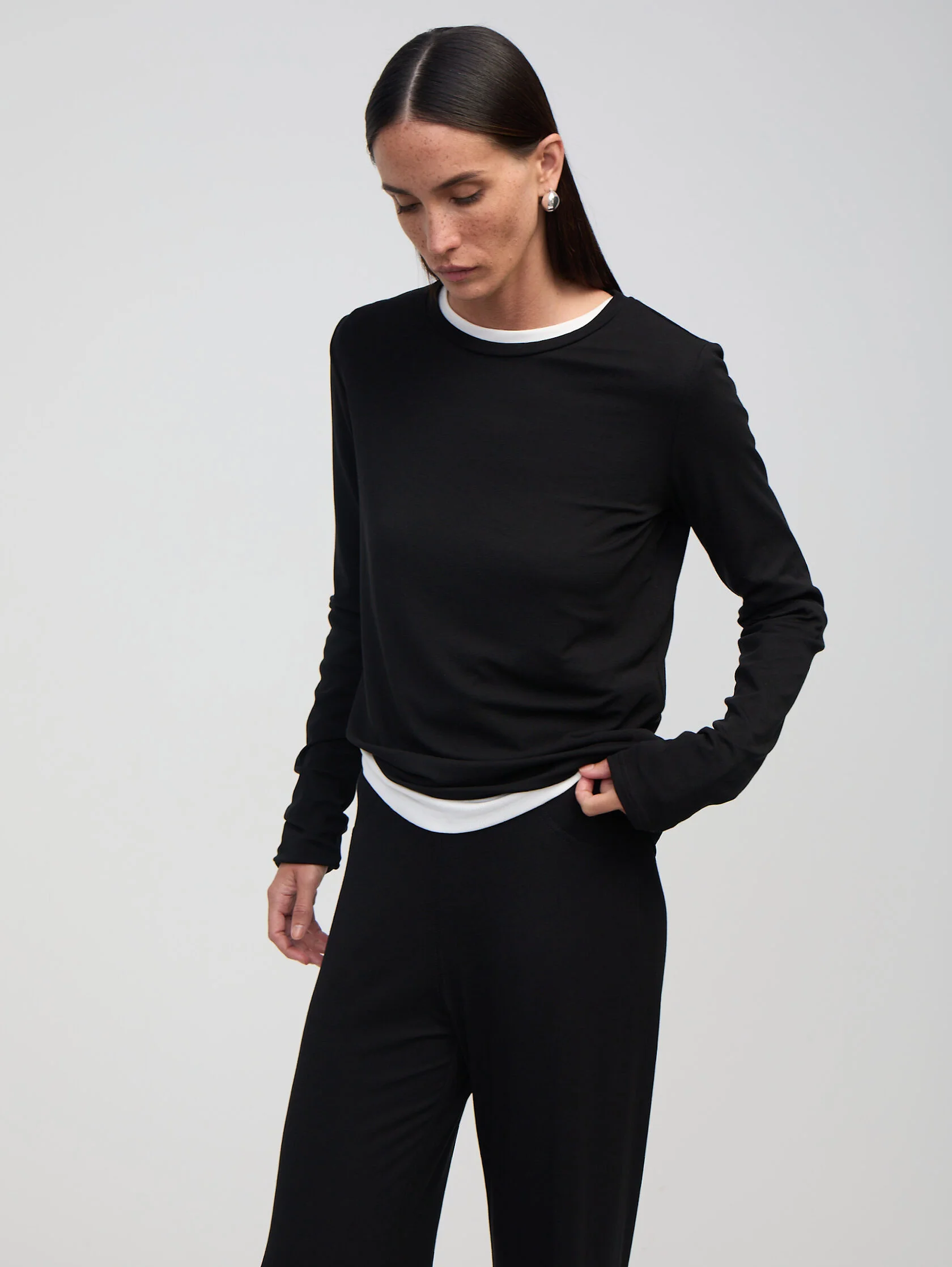 Элегантный лонгслив из тонкого трикотажа. Модель легко сочетать с классическими брюками и джинсами, а также с брюками из тонкого трикотажа из капсулы бренда.