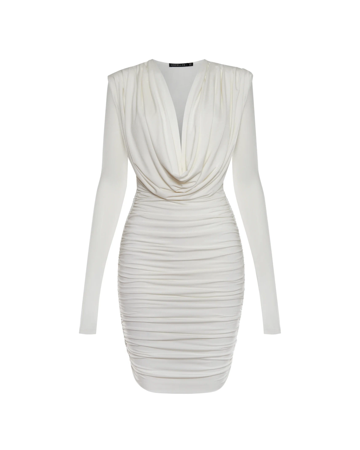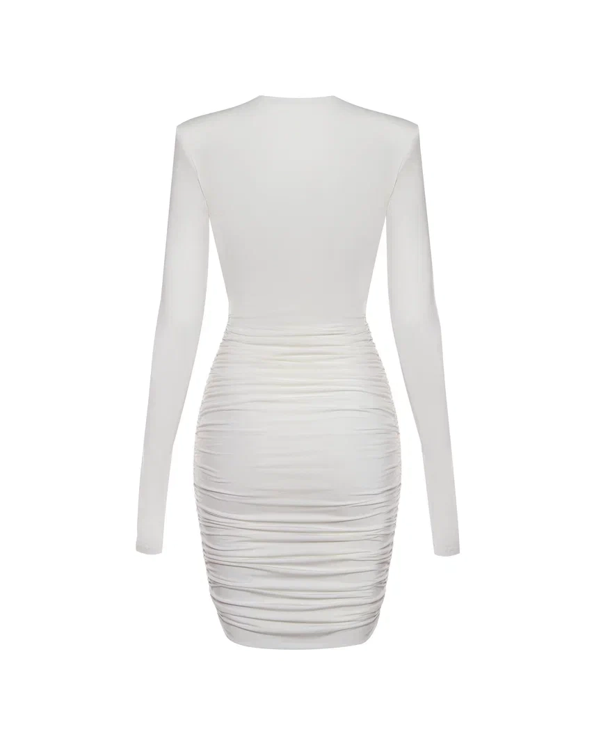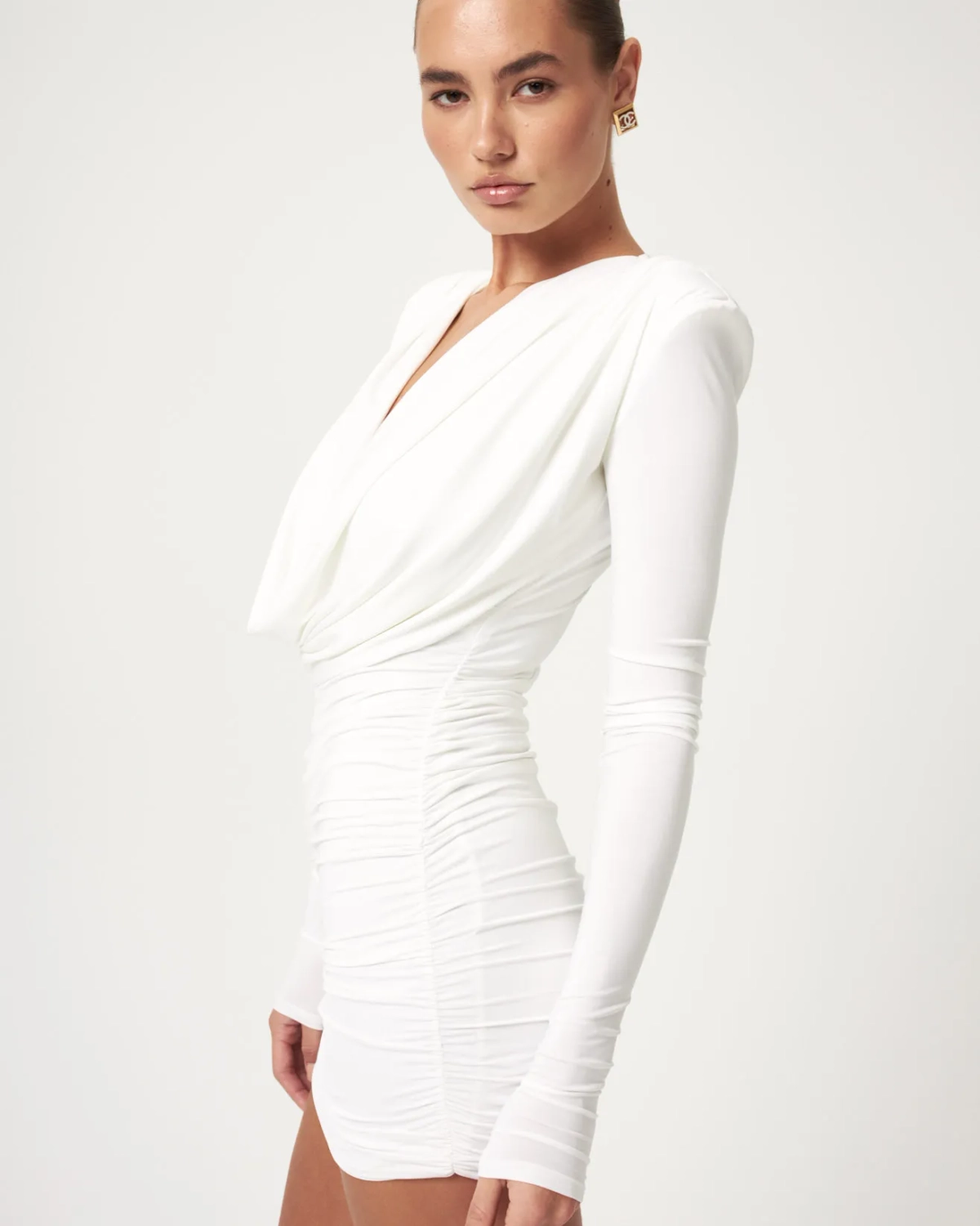 Платье Alma — изящный вариант для особых случаев и вечеринок. Глубокий V-образный вырез с мягкой драпировкой подчёркивает линию декольте, а облегающий мини-силуэт формирует акцент на фигуре. Длинные рукава и деликатные сборки добавляют образу динамичности и актуальности. Это платье идеально для тех, кто выбирает современную элегантность и хочет выделиться на любом событии.