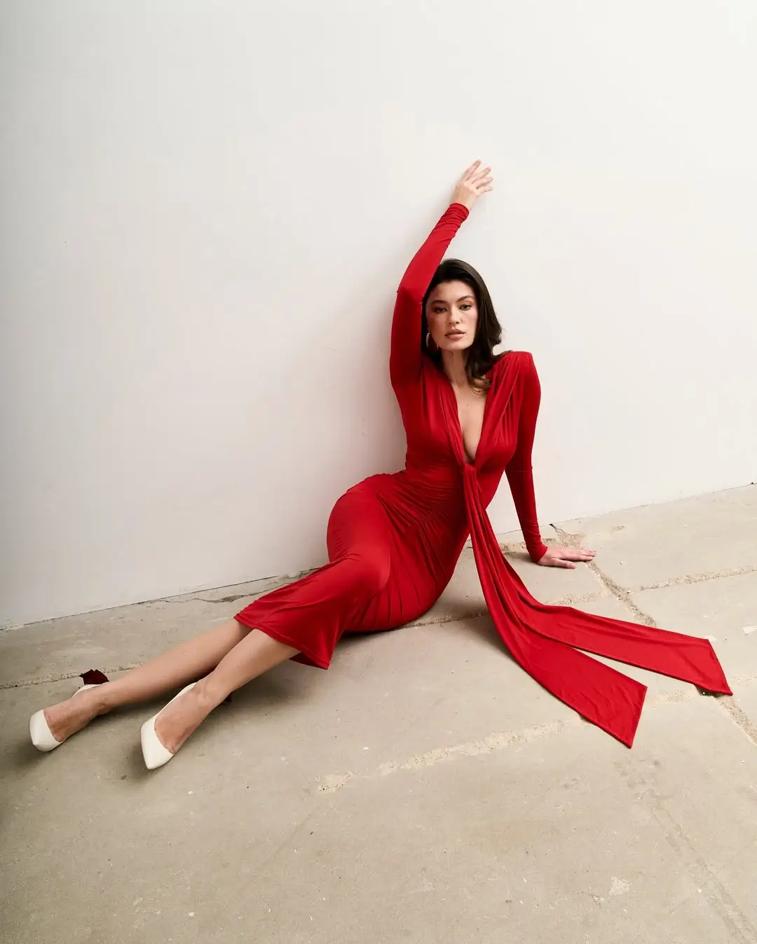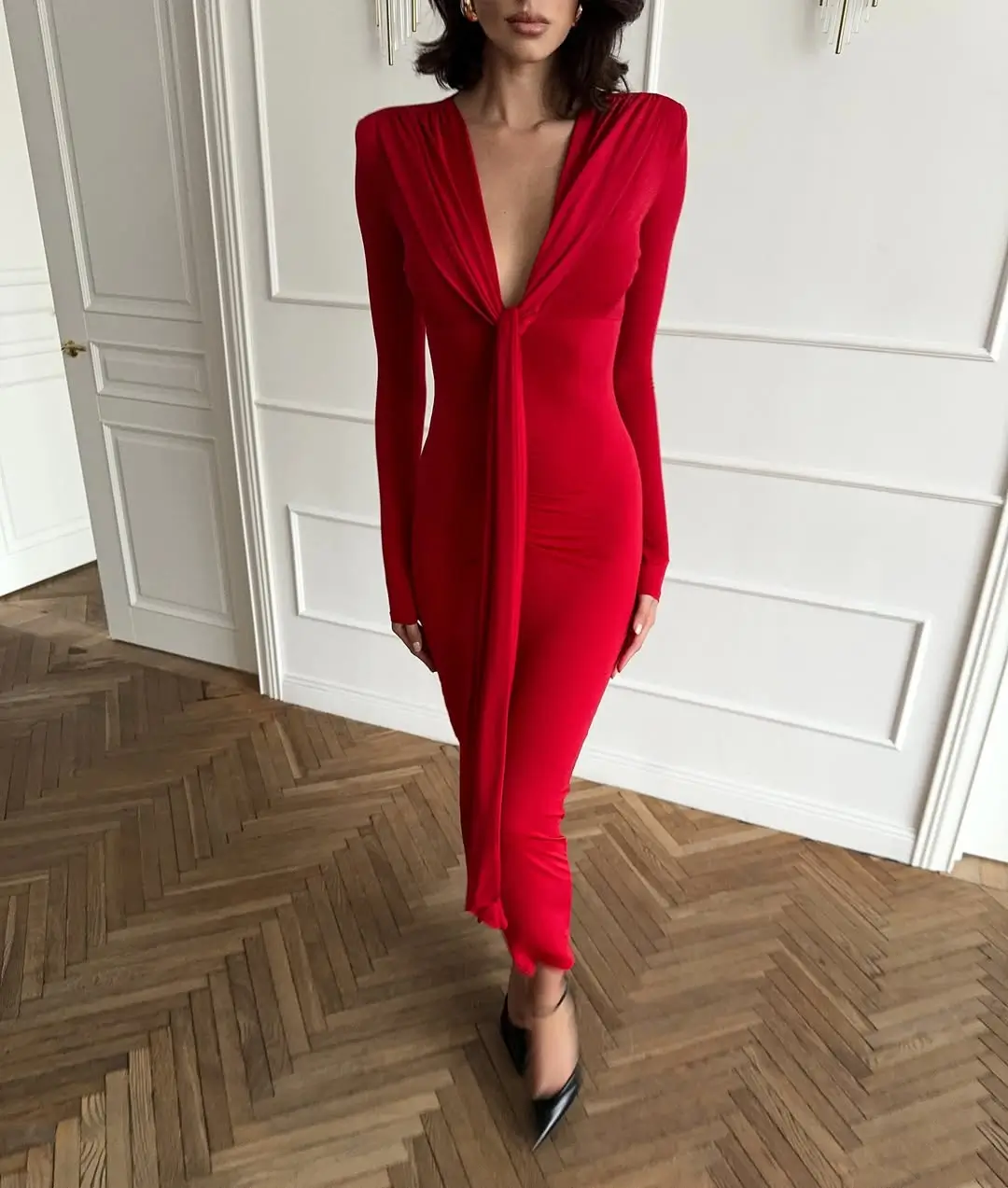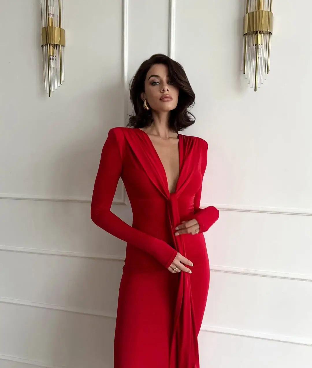 Платье Bilberry — идеальный вариант для особых случаев и торжественных мероприятий. Глубокое декольте, мягкие драпировки и приталенный силуэт формируют образ с ноткой ретро-романтики. Длинный рукав и фактурная ткань подчеркивают утончённость и изысканность, а удобная посадка обеспечивает комфорт на протяжении всего вечера.