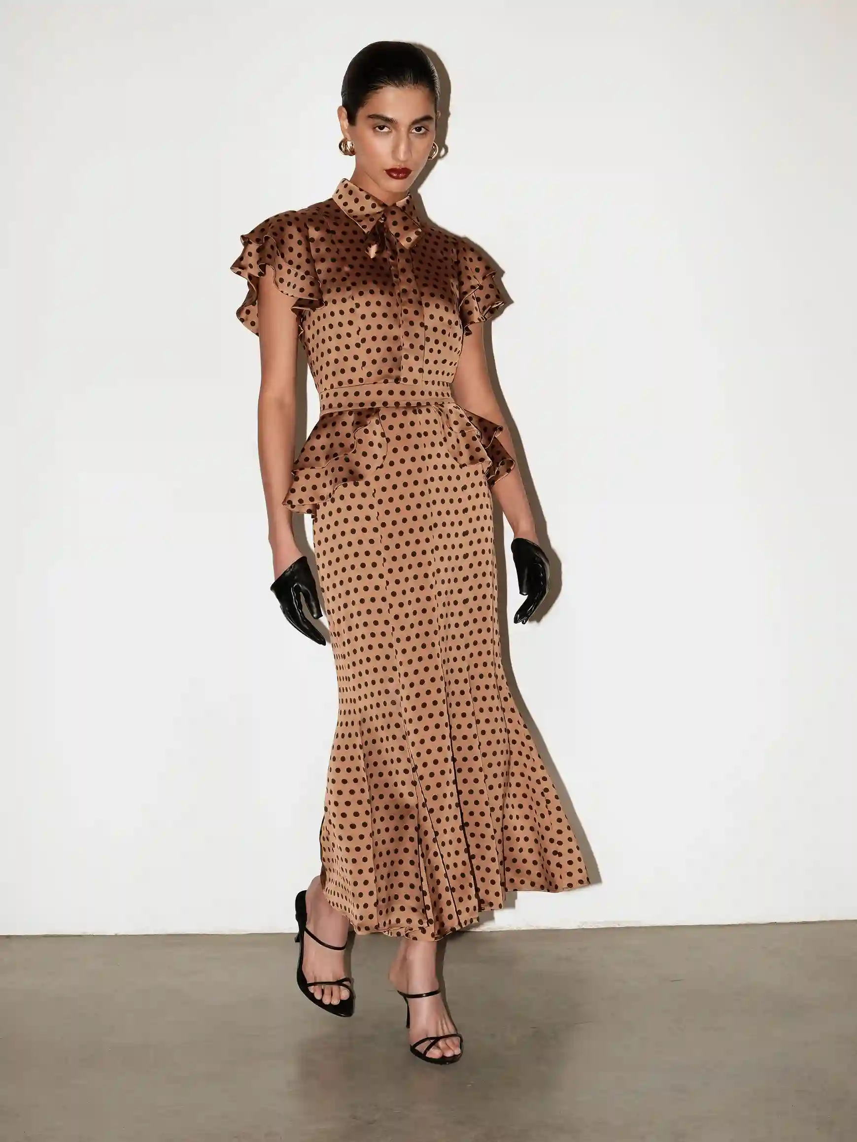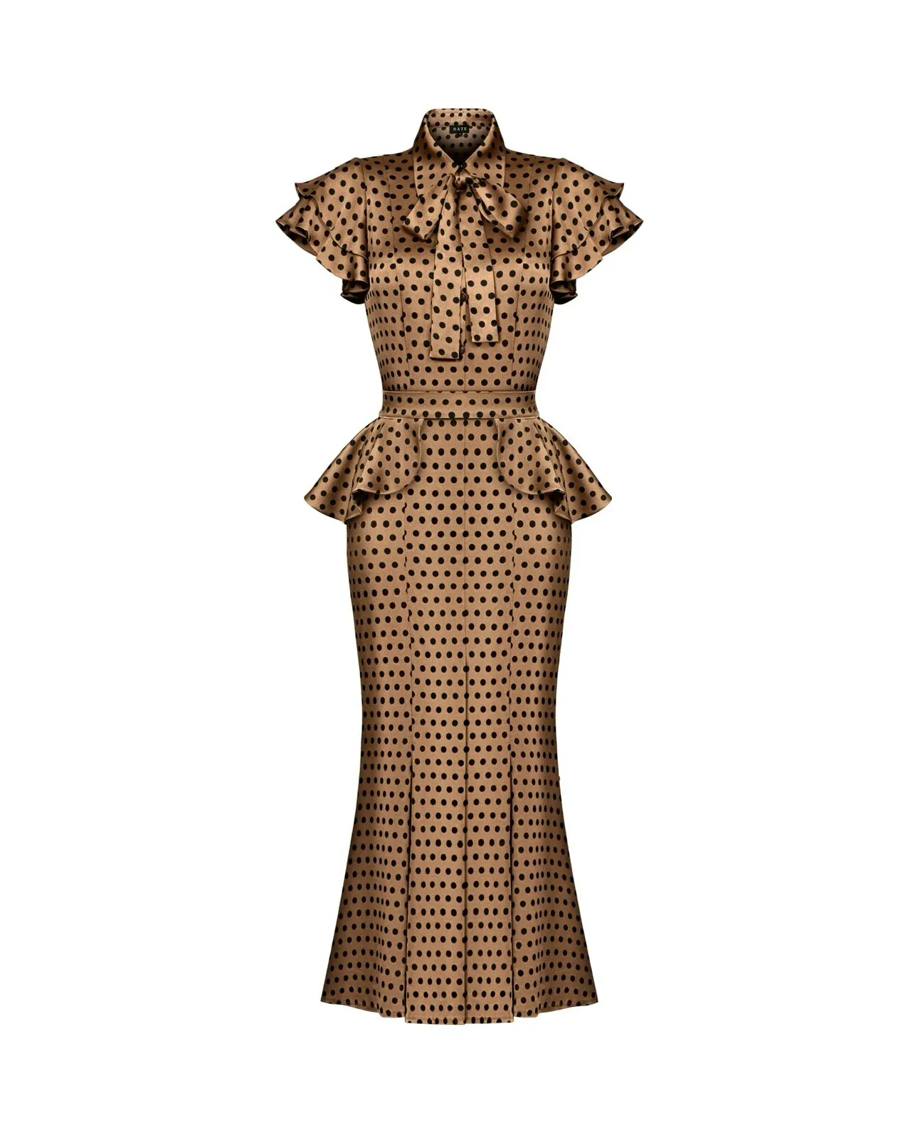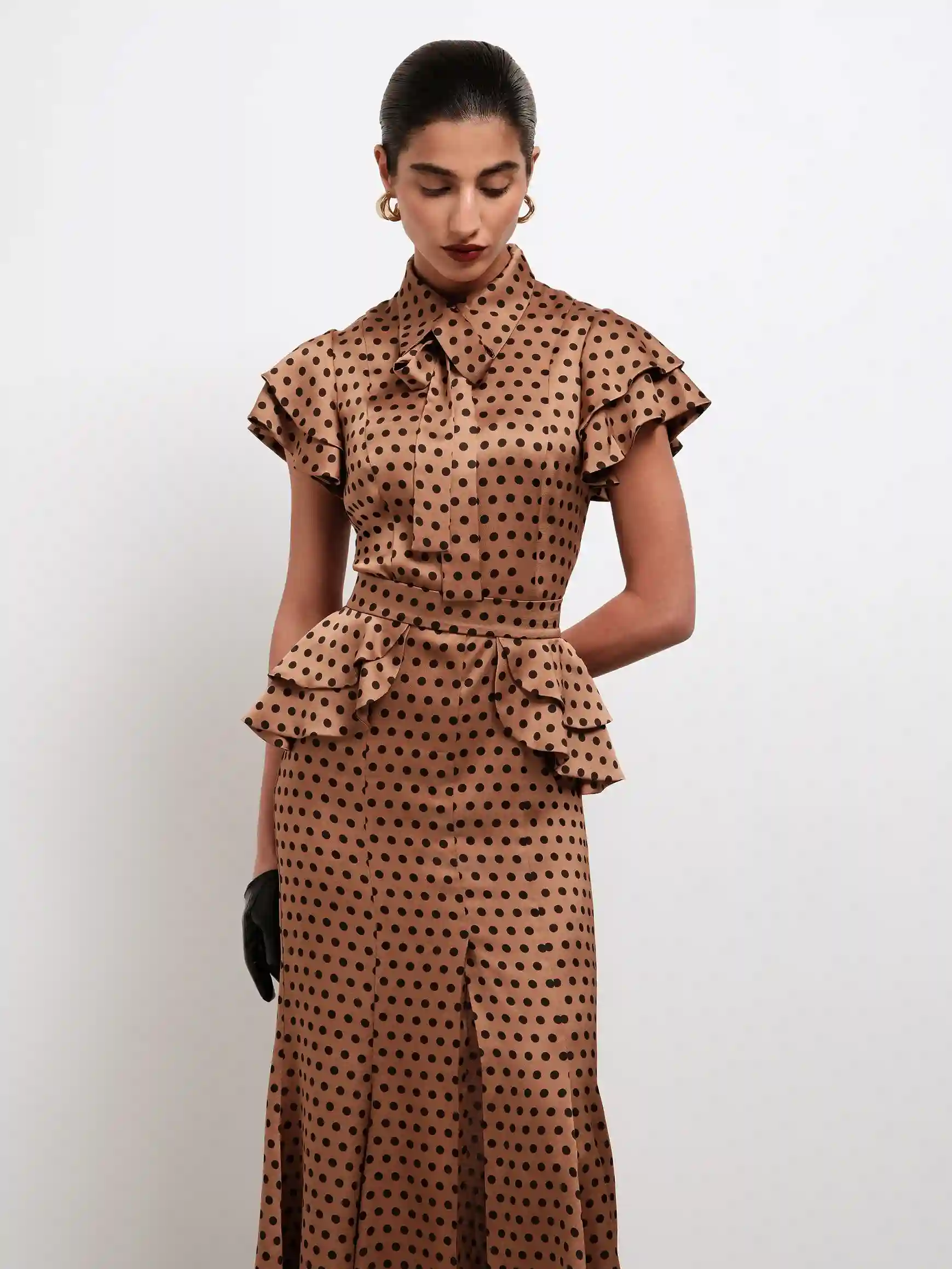 Модель выполнена из струящейся ткани с деликатным переливом, которая мягко движется по телу и создаёт элегантную динамику в образе. Баска акцентирует талию и делает силуэт ещё более выразительным. Съёмный пояс входит в комплект и позволяет варьировать подачу — от более собранной и эффектной до сдержанной и повседневной.