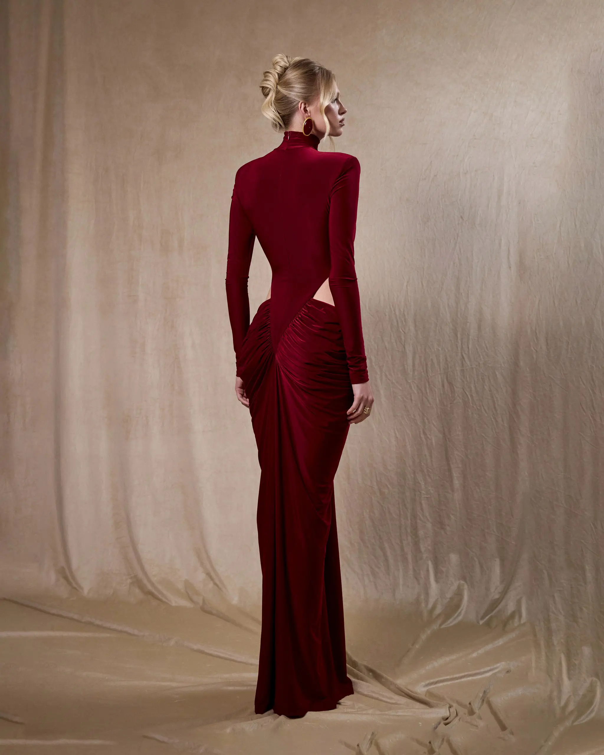 Создано из вискозы с добавлением эластана, оно мягко повторяет линии фигуры, сохраняя безупречный комфорт в движении. Продуманная длинная молния на спине обеспечивает лёгкость посадки, а подплечники придают силуэту чёткость и характер. Драпировки на бёдрах акцентируют талию, создавая гармоничные пропорции «песочных часов».