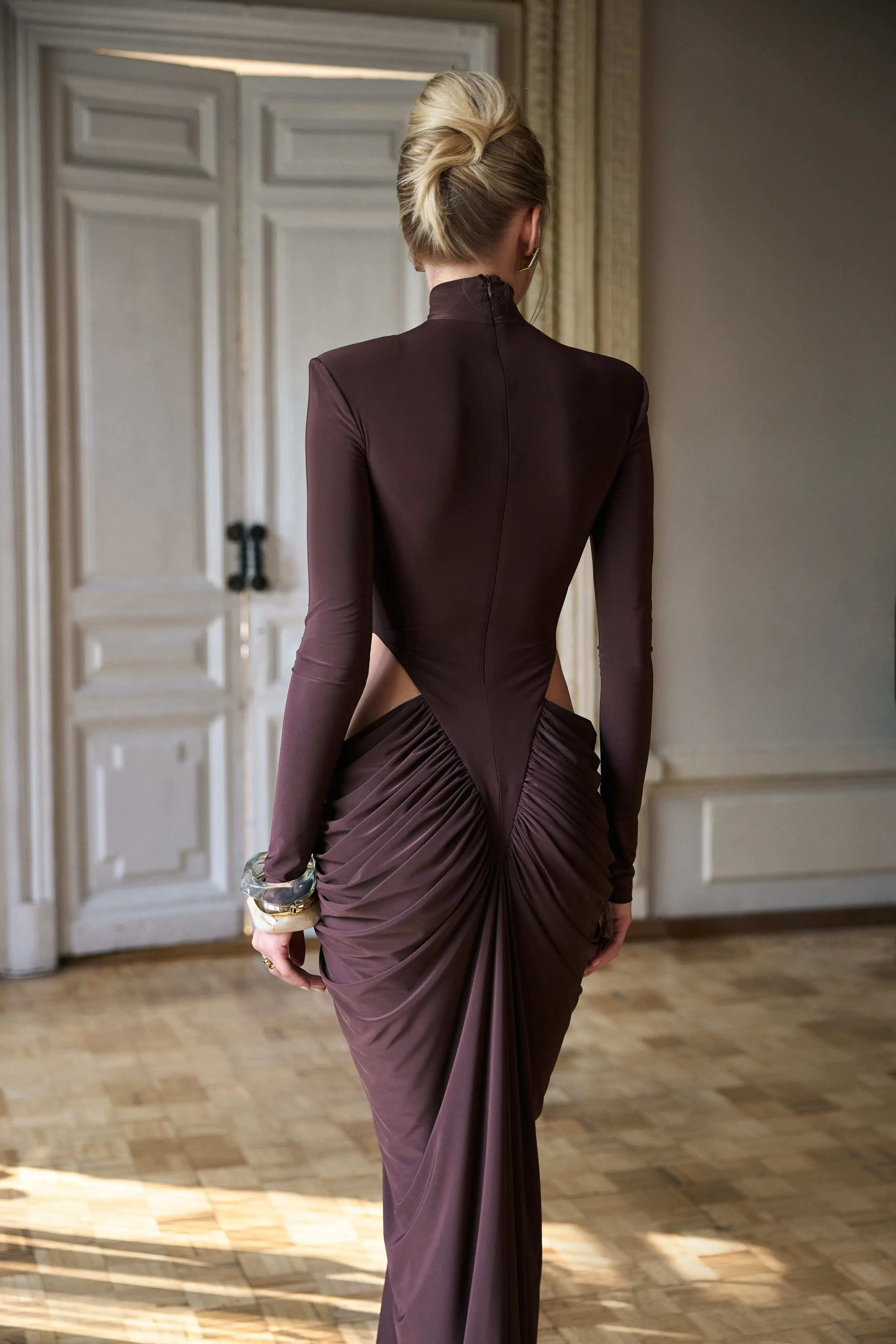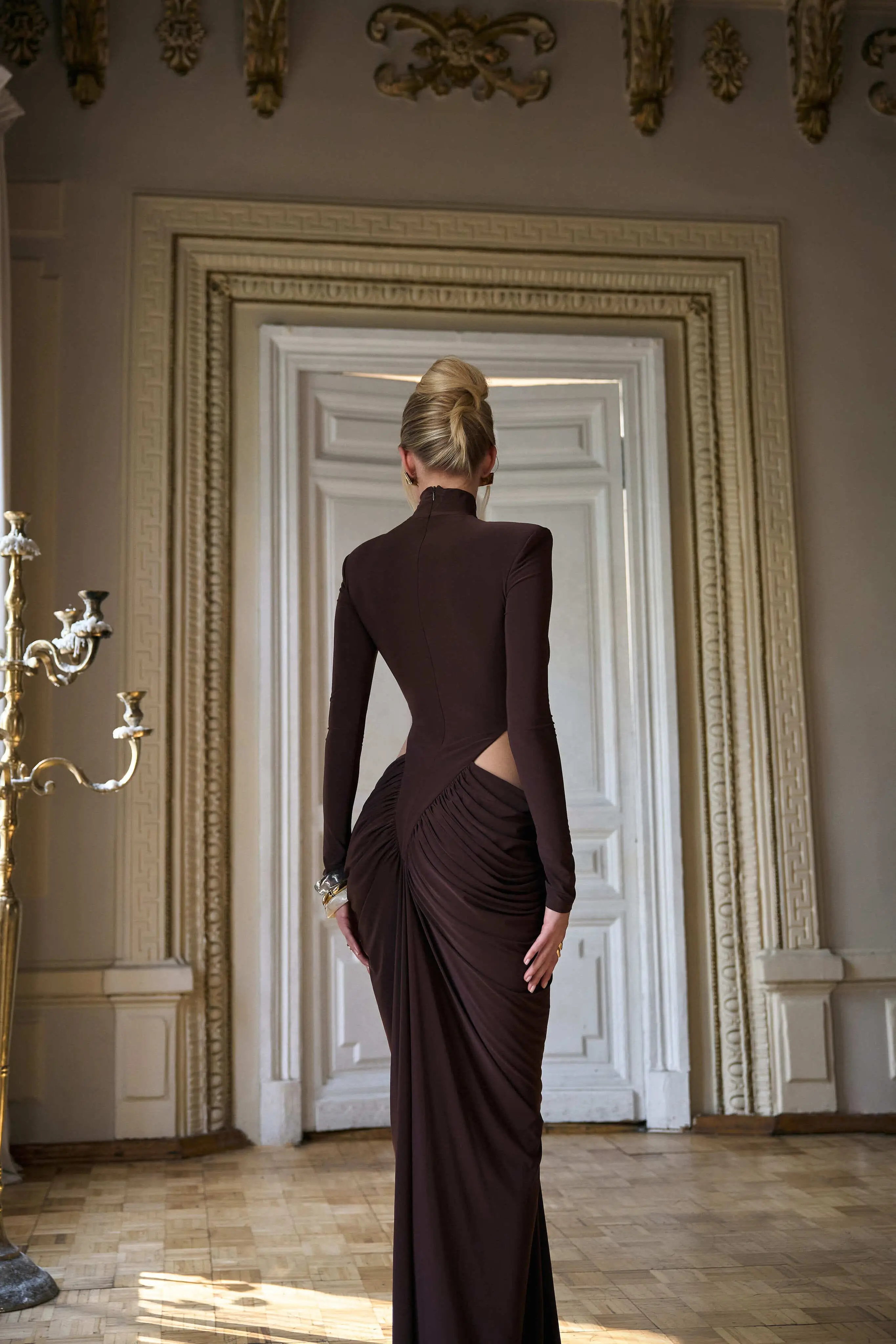 Создано из вискозы с добавлением эластана, оно мягко повторяет линии фигуры, сохраняя безупречный комфорт в движении. Продуманная длинная молния на спине обеспечивает лёгкость посадки, а подплечники придают силуэту чёткость и характер. Драпировки на бёдрах акцентируют талию, создавая гармоничные пропорции «песочных часов».