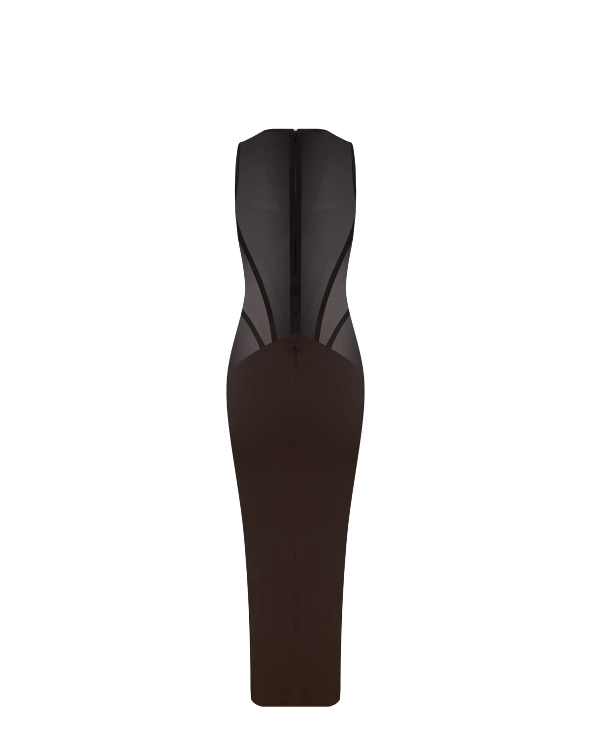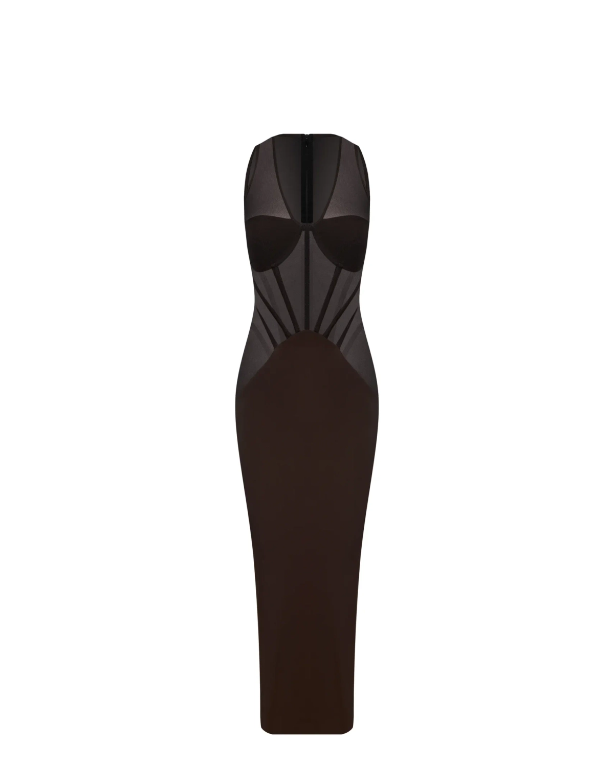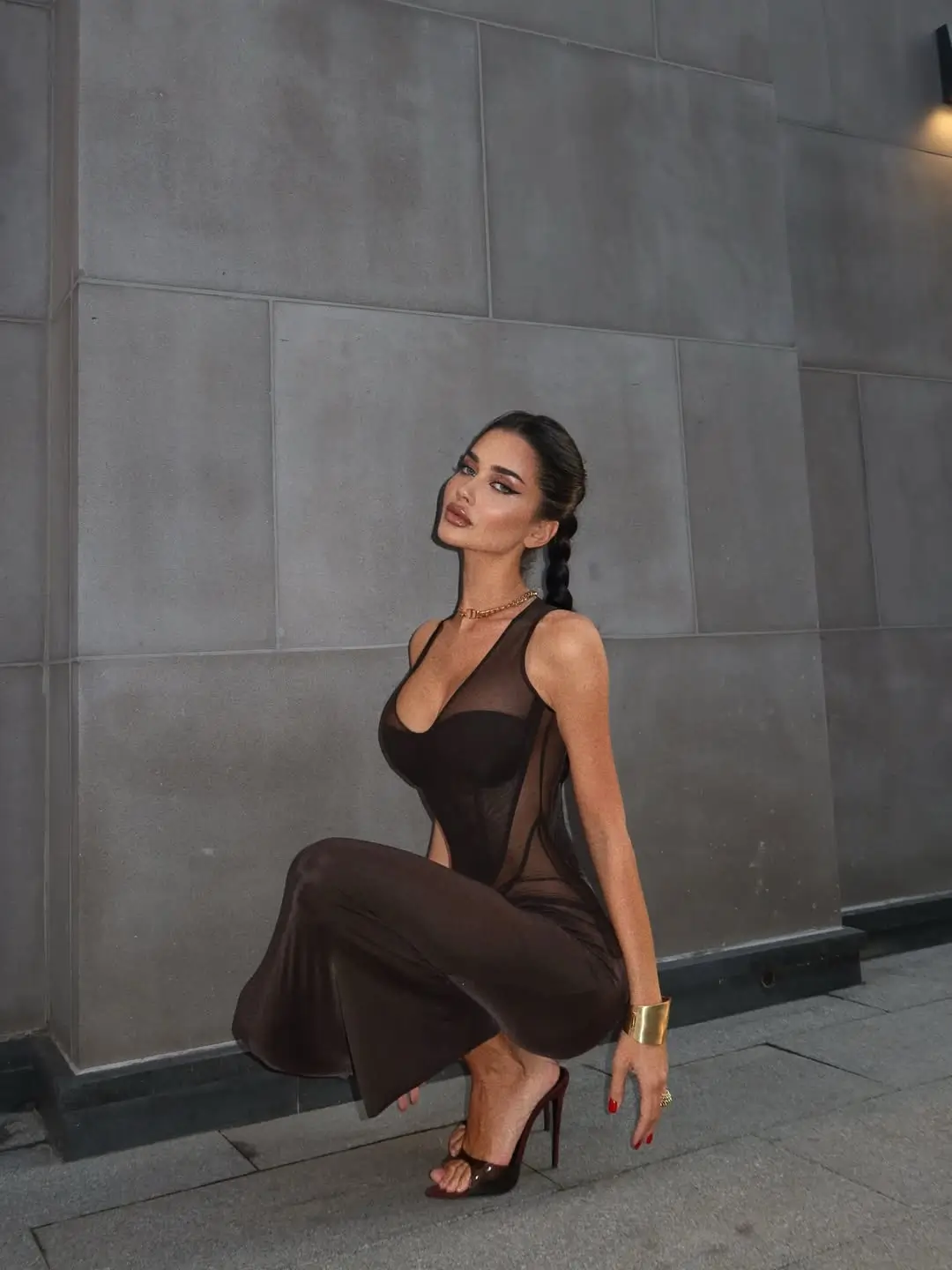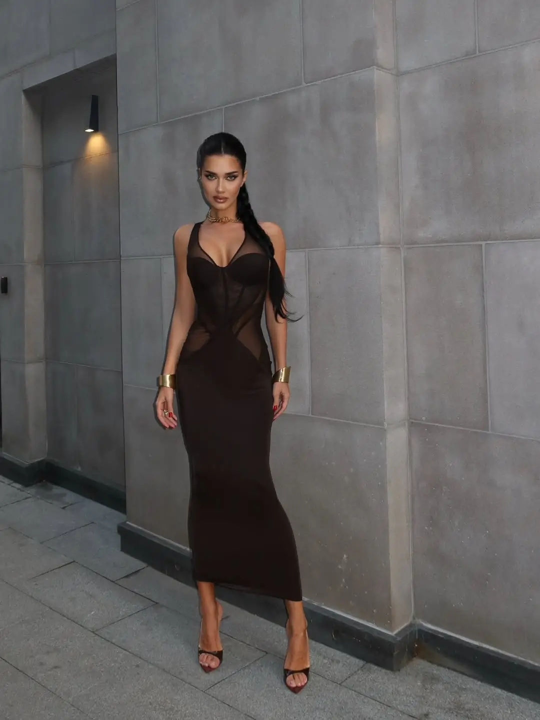 Платье-корсет Greta Choco — смелое воплощение женственности и элегантности. Полупрозрачные вставки и корсетный крой изящно подчеркивают линии тела, создавая гармоничный силуэт. Глубокий шоколадный оттенок добавляет образу утончённости, а длина миди делает платье универсальным для особых случаев и вечерних выходов. Минималистичный дизайн не требует излишних деталей и позволяет выглядеть эффектно в любой обстановке.