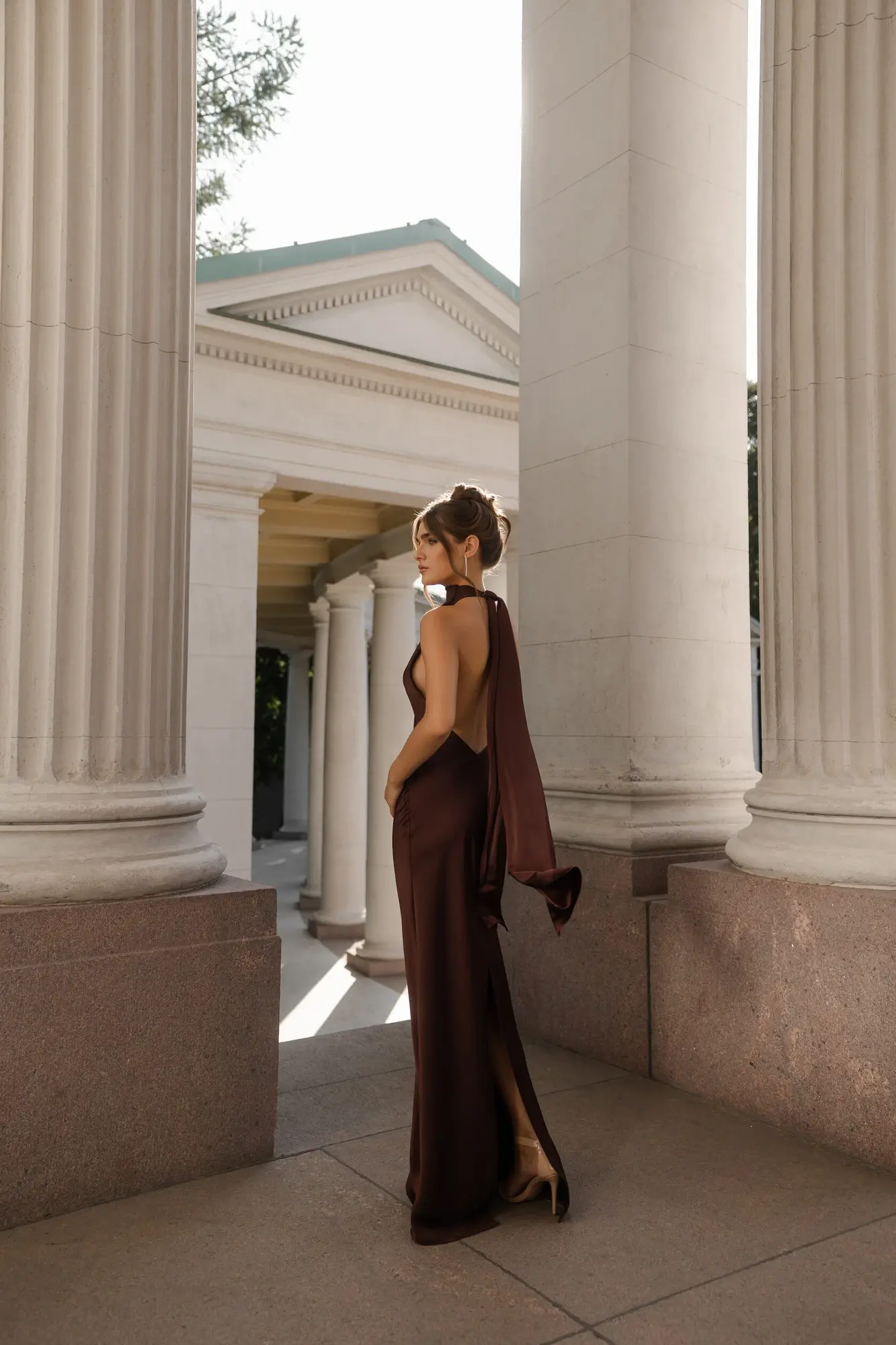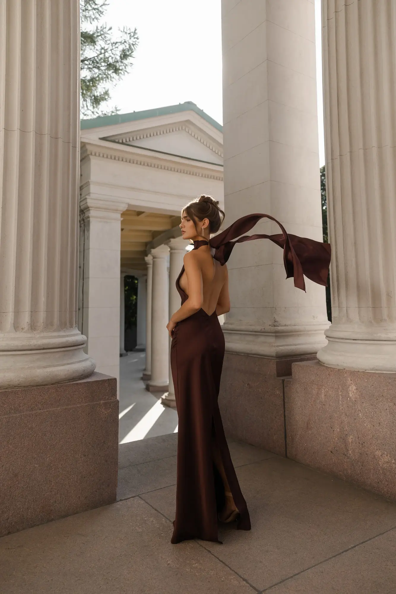 Платье удлиненного силуэта с открытой спинкой и роскошным шлейфом. Шарф можно завязать на узел, либо создать объемный бант.
