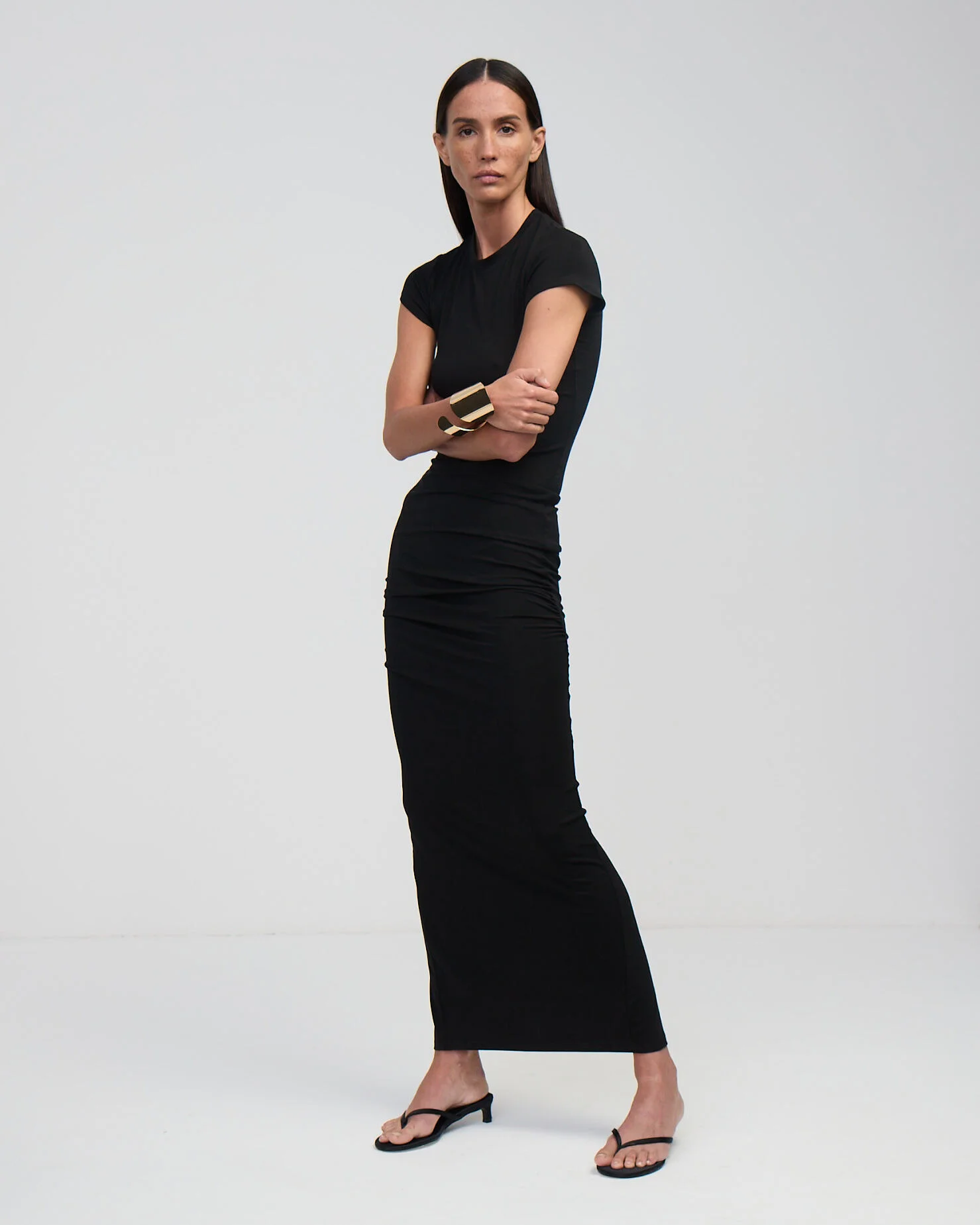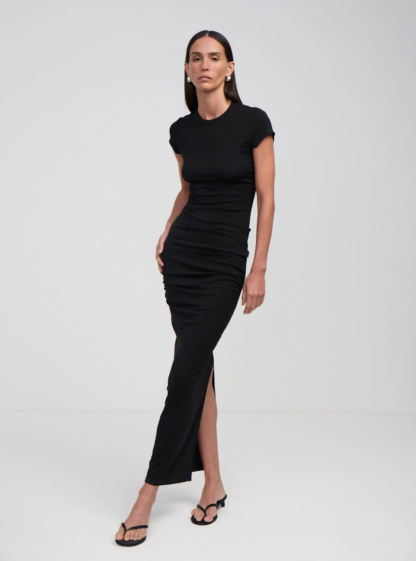 Платье минималистичного кроя из нежного и легкого трикотажа. Прилегающий силуэт по фигуре, разрез по спинке. Эффектная модель для теплого сезона.