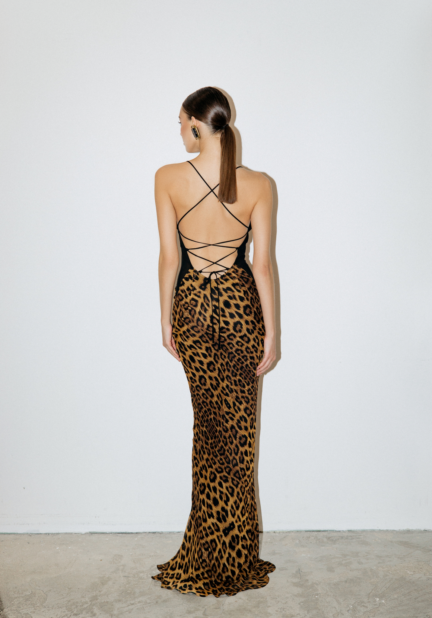 Платье-комбинация из струящеящегося шифона с леопардовым принтом. Модель приталенного кроя с открытой спиной, тонкими перекрестными бретелями, переходящими в шнуровку на спине, драпировкой в зоне декольте. Классические линии кроя платья идеально обрисовывают женственный силуэт.