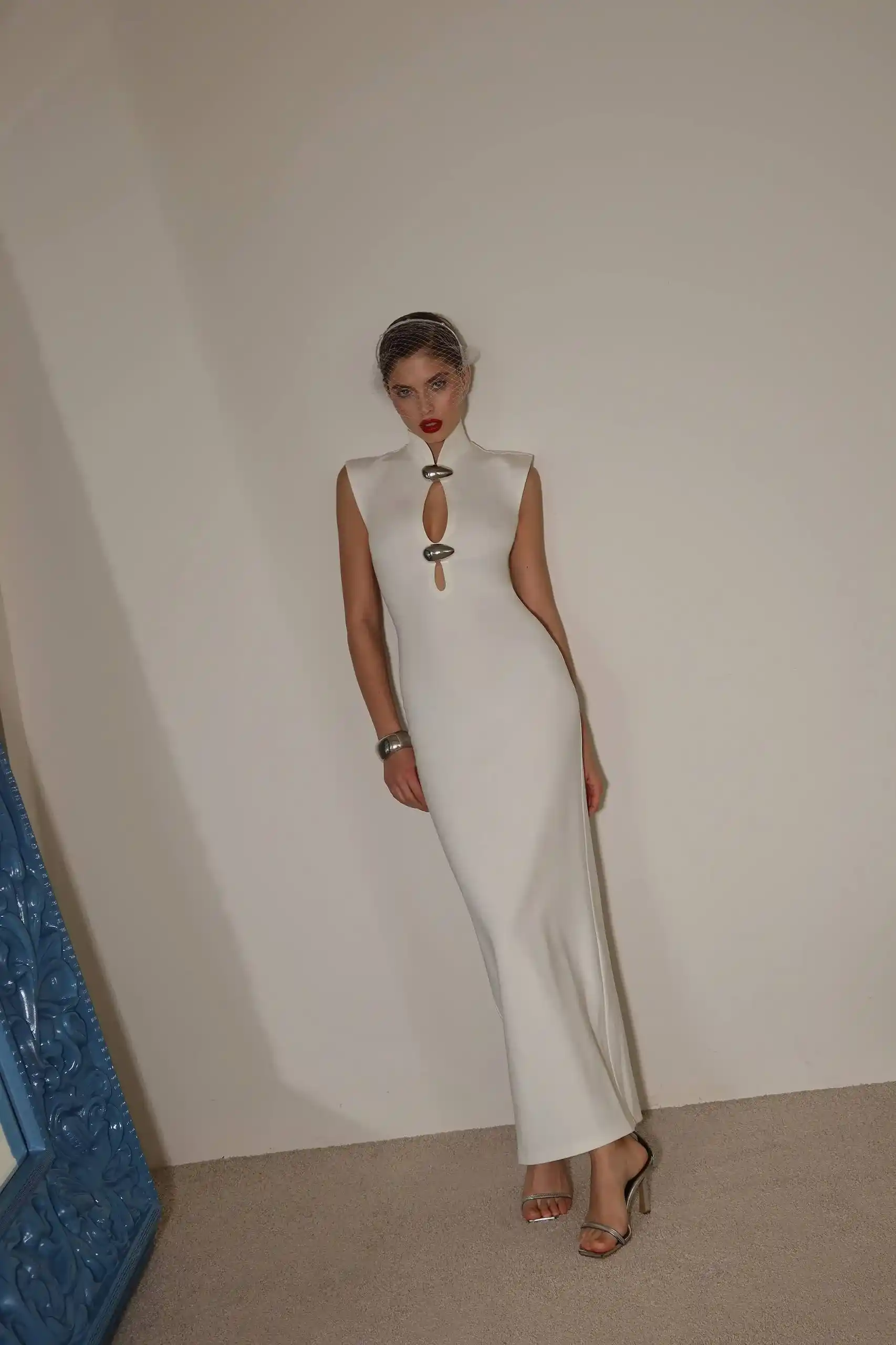 Приталенный силуэт с расширенной зоной плеча визуально моделирует эстетичную форму песочных часов, а вкусные акценты в виде азиатского воротника , вырезов в форме капель декорированные серебряные, съемными брошами подчеркивают зону декольте.
