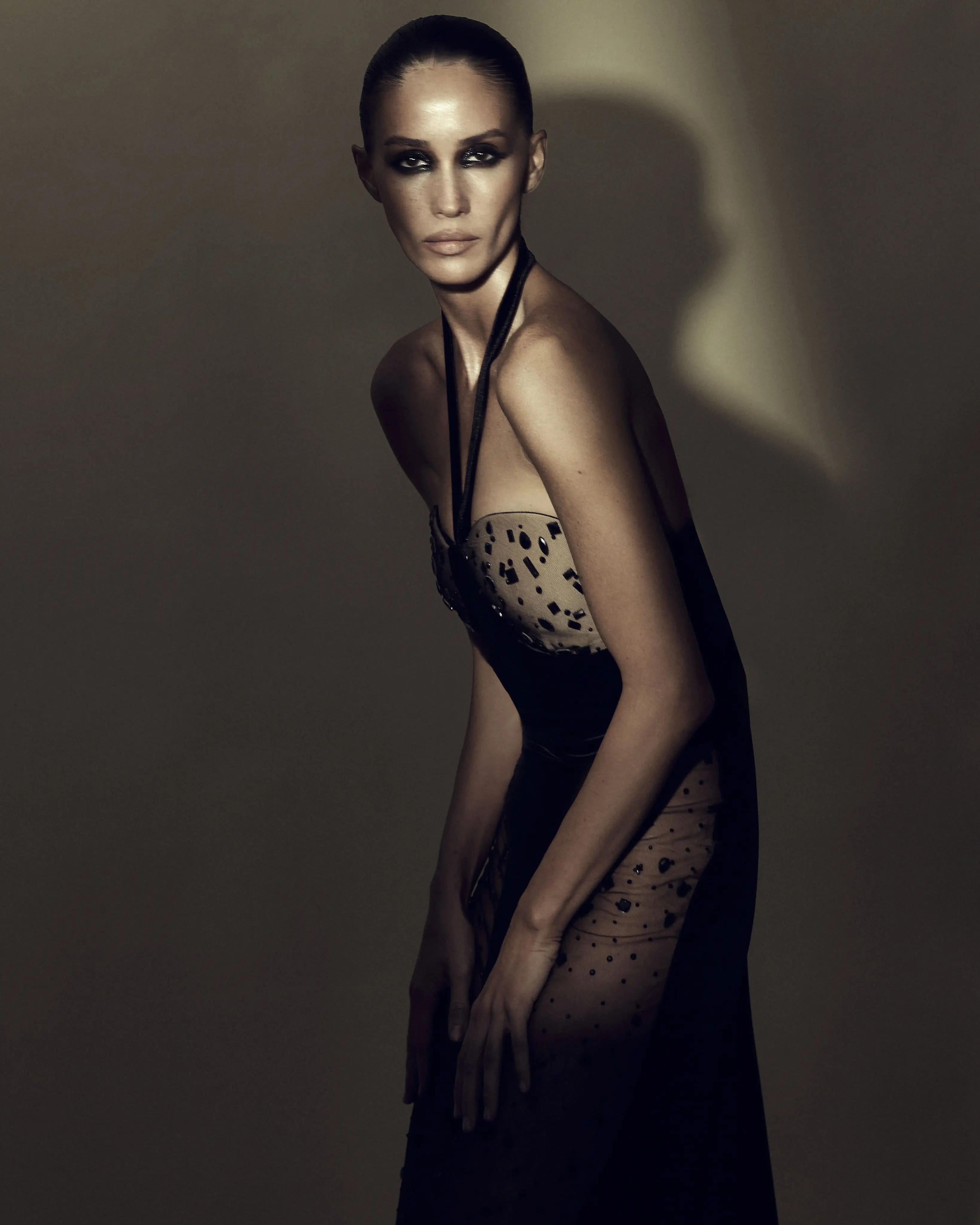 Платье с открытой линией плеч, глубоким декольте и открытой спиной в длине макси. Модель фиксируется завязками вокруг шеи и имеет корсетный крой, подчёркивающий талию. Контрастные прозрачные вставки из сетки создают акцентный вертикальный силуэт и украшены рассыпным декором.