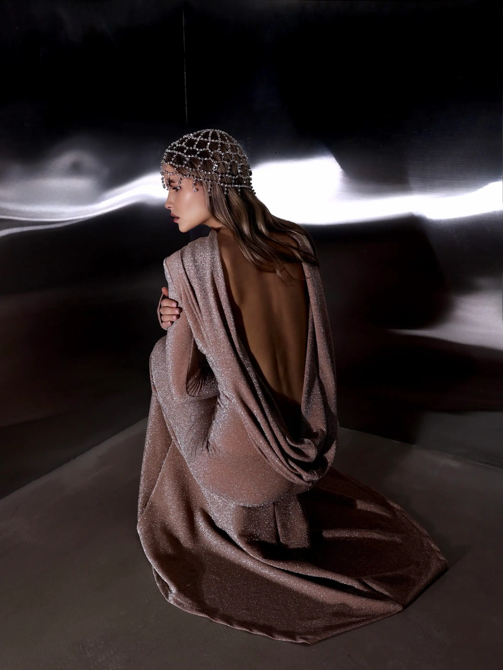 Платье с открытой спиной и шлейфом, Бежевый