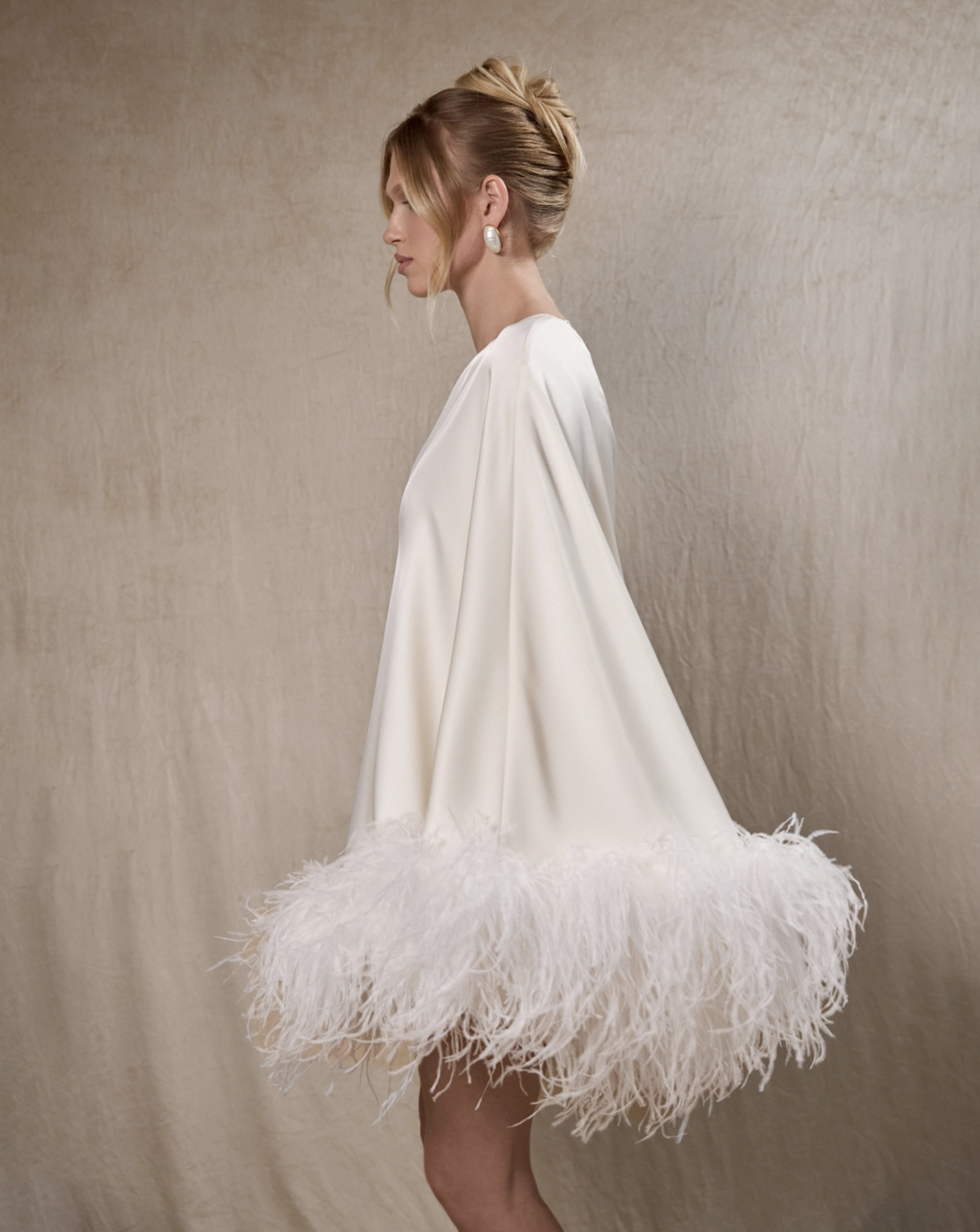 Асимметричный крой на одно плечо придаёт образу современную элегантность. Завершающий штрих — акцентная отделка из премиальных перьев страуса, добавляющая образу изысканности и эффектности.