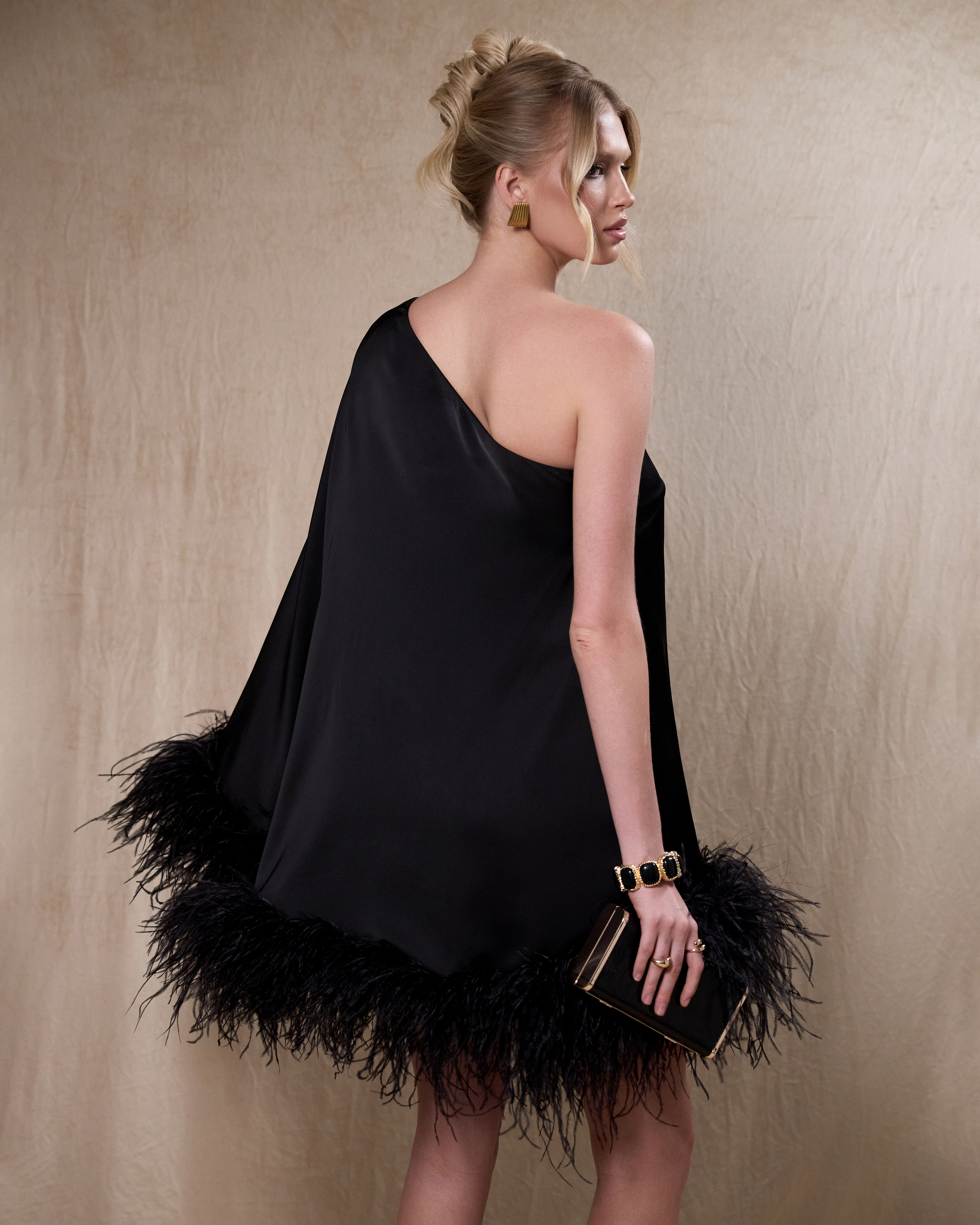 Асимметричный крой на одно плечо придаёт образу современную элегантность. Завершающий штрих — акцентная отделка из премиальных перьев страуса, добавляющая образу изысканности и эффектности.