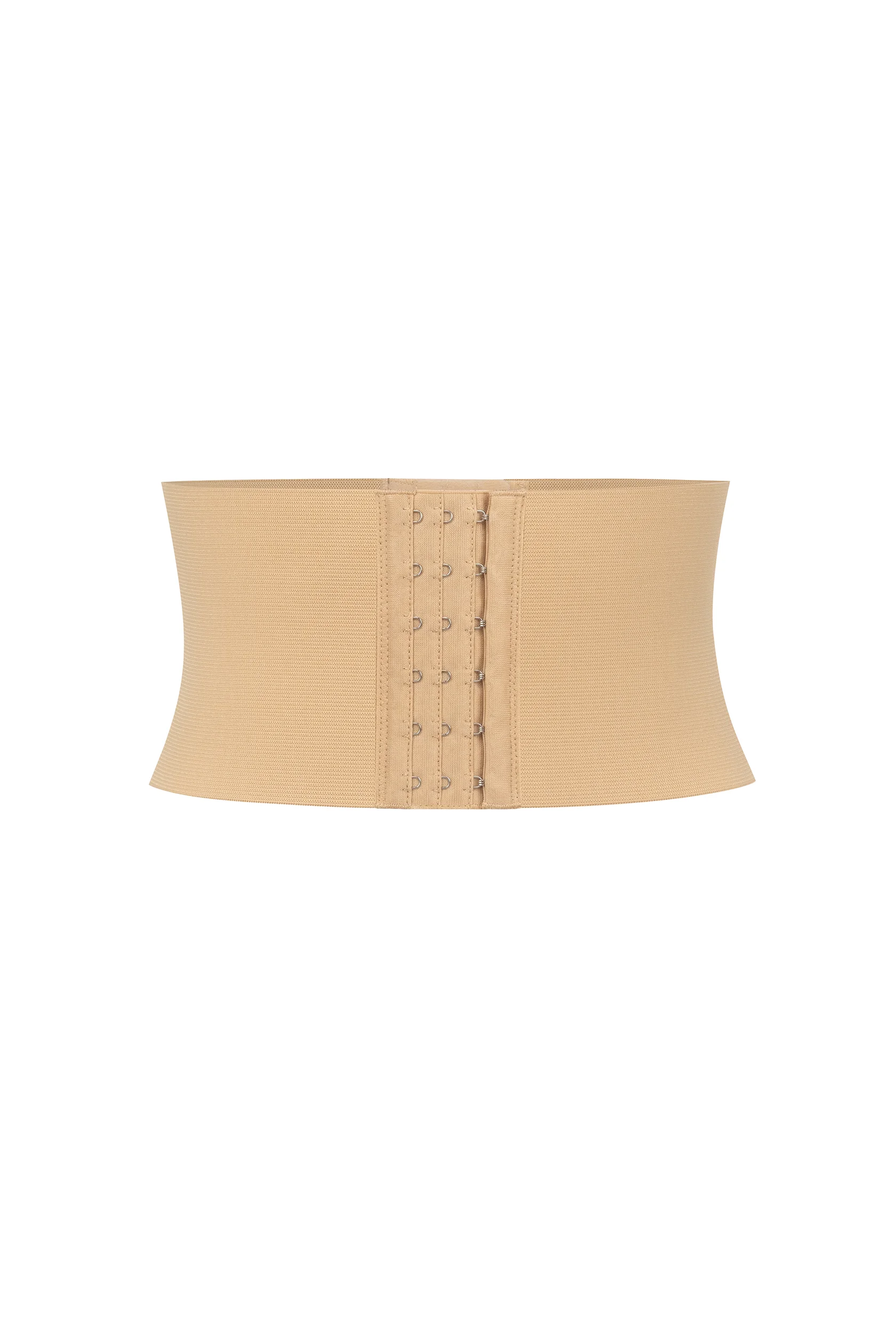 Пояс бандаж утягивает и фиксирует талию. Эластичность материала обеспечивает комфортную посадку. Пояс украшен декоративными крючками и функциональной застежкой.
