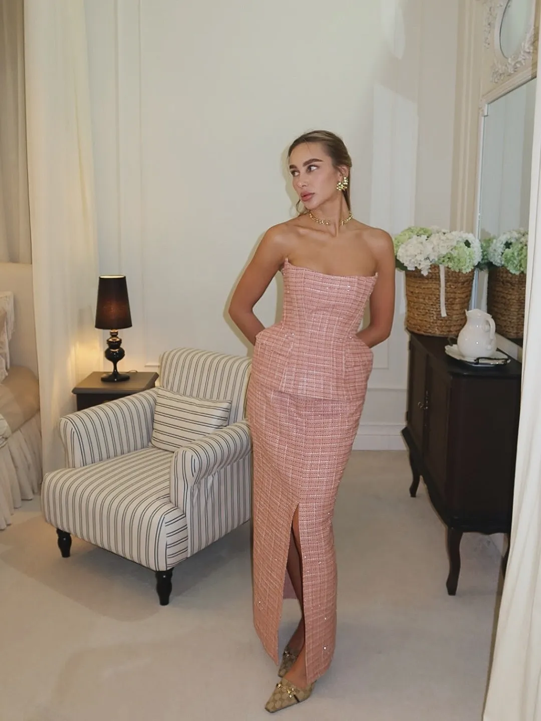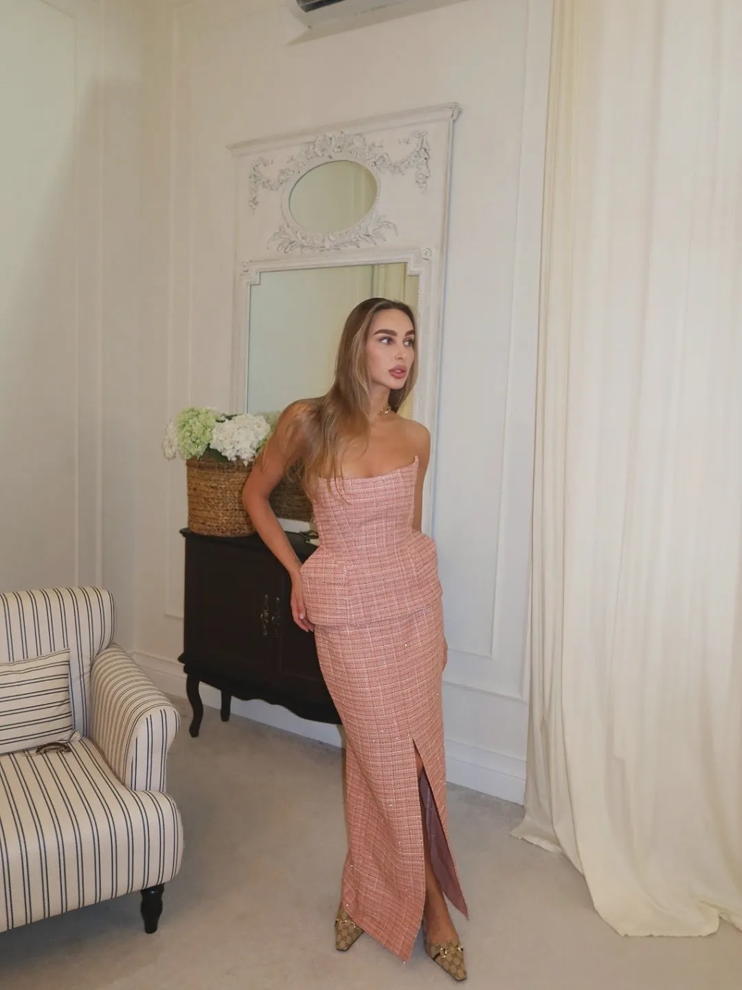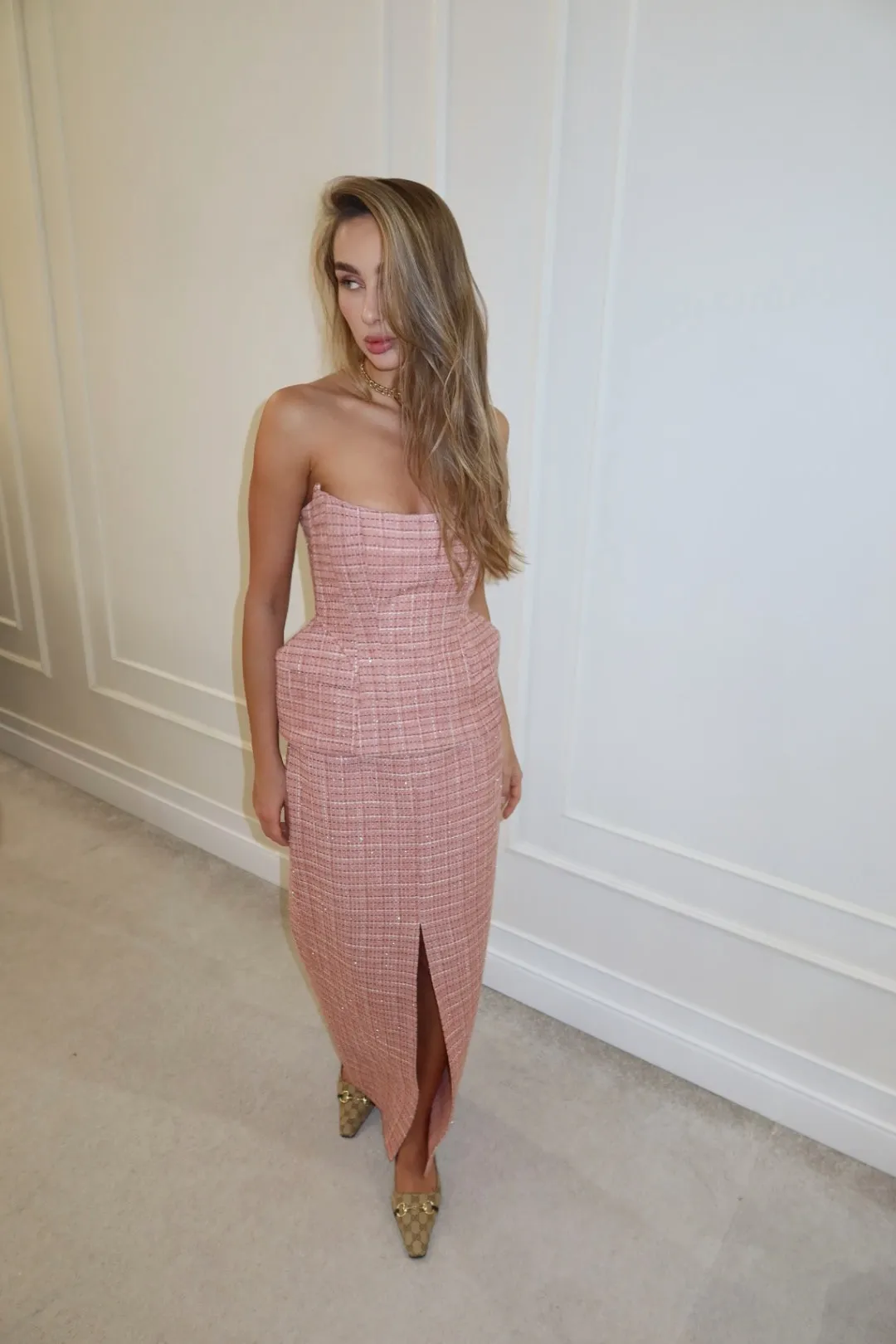 Юбка макси с разрезом спереди из твида, Розовый