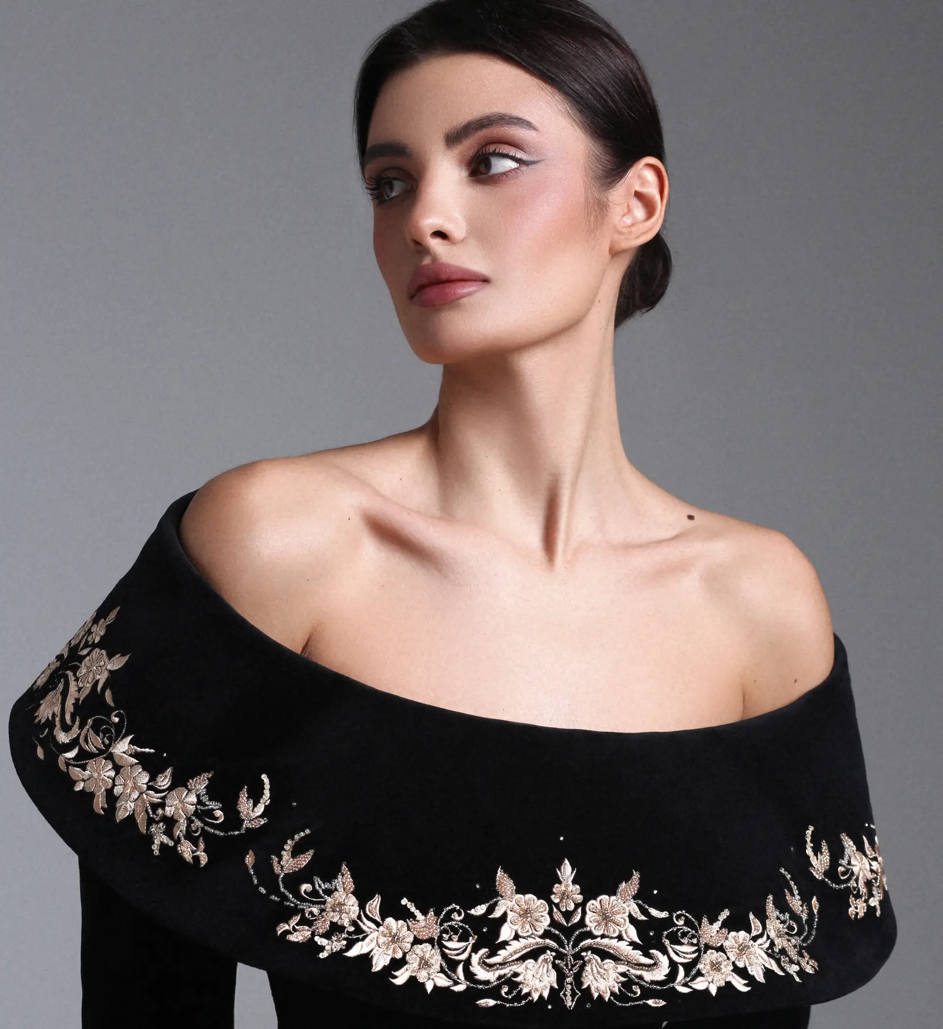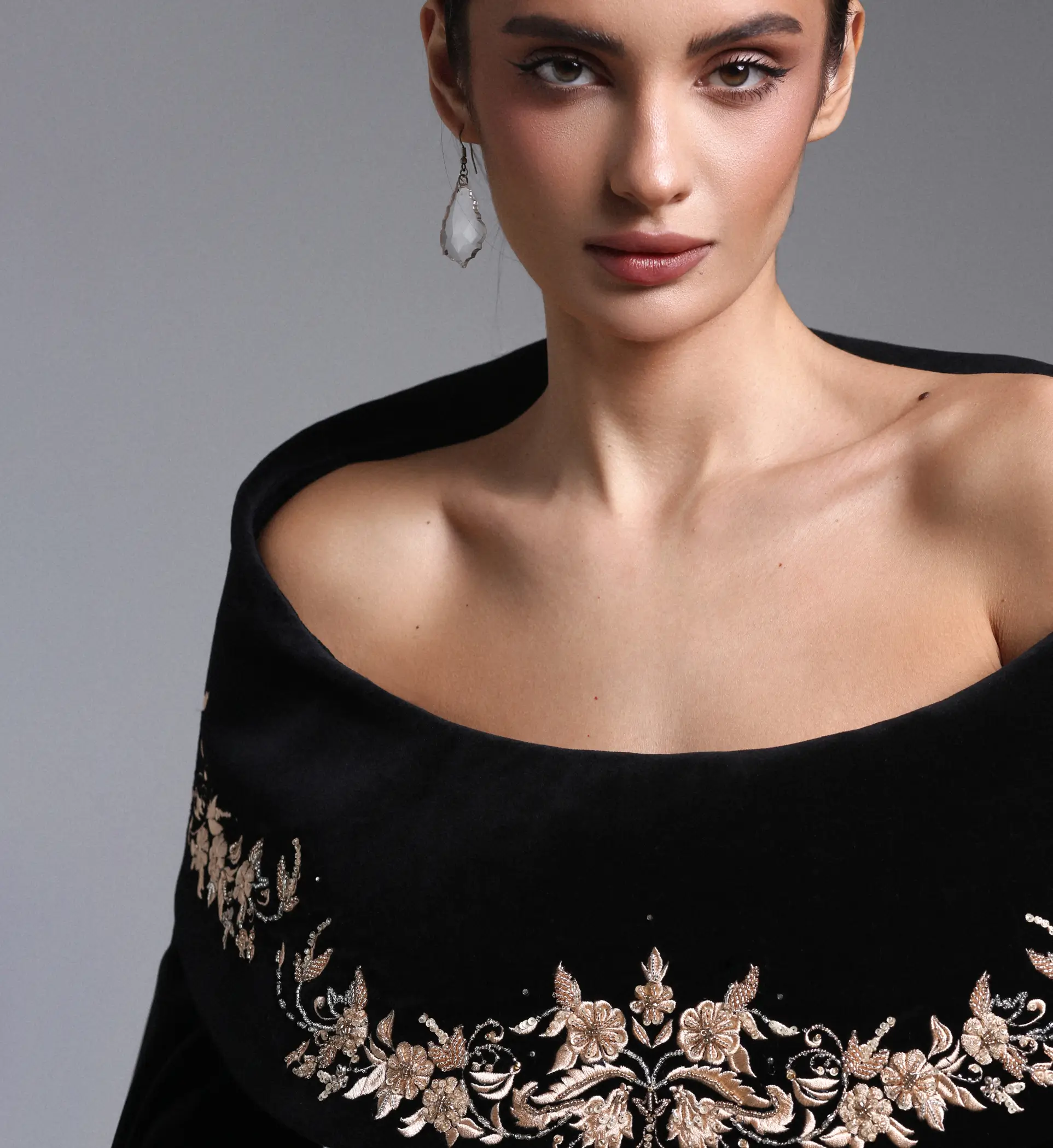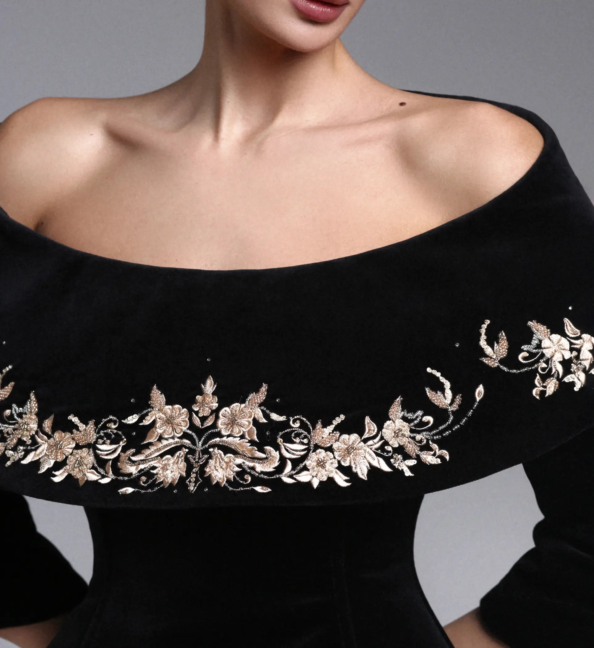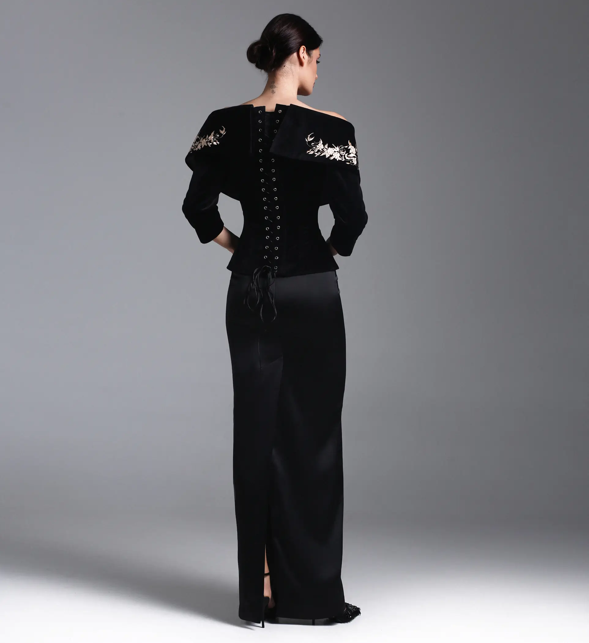 Корсетный жакет в черном цвете с открытыми плечами из бархата с ручной вышивкой стеклярусом и шелковыми нитями.