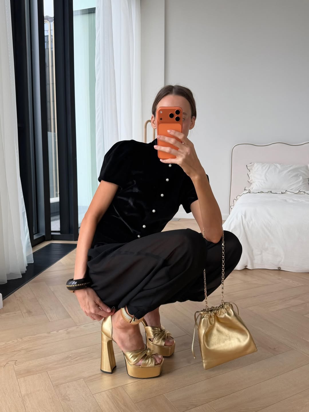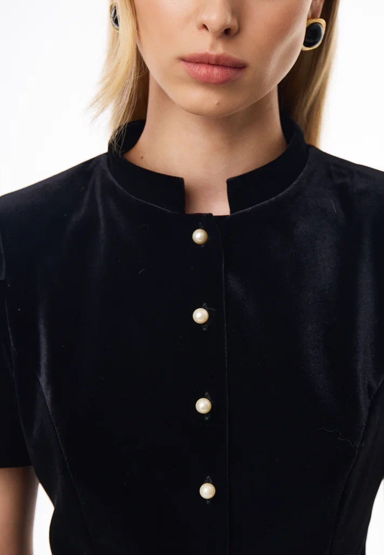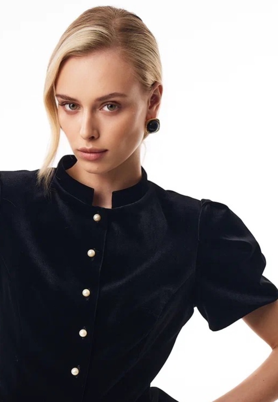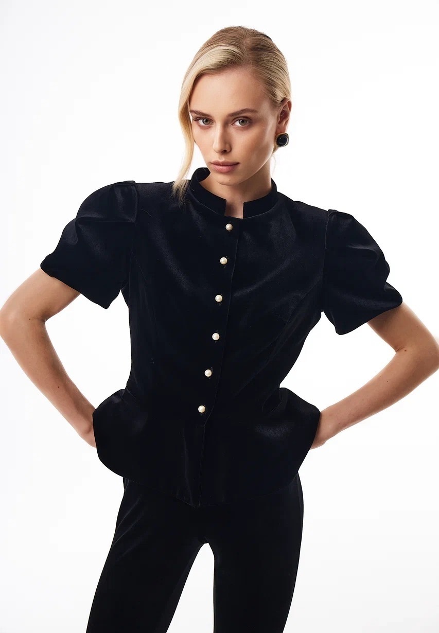 Жакет из бархата с акцентными перламутровыми пуговицами.