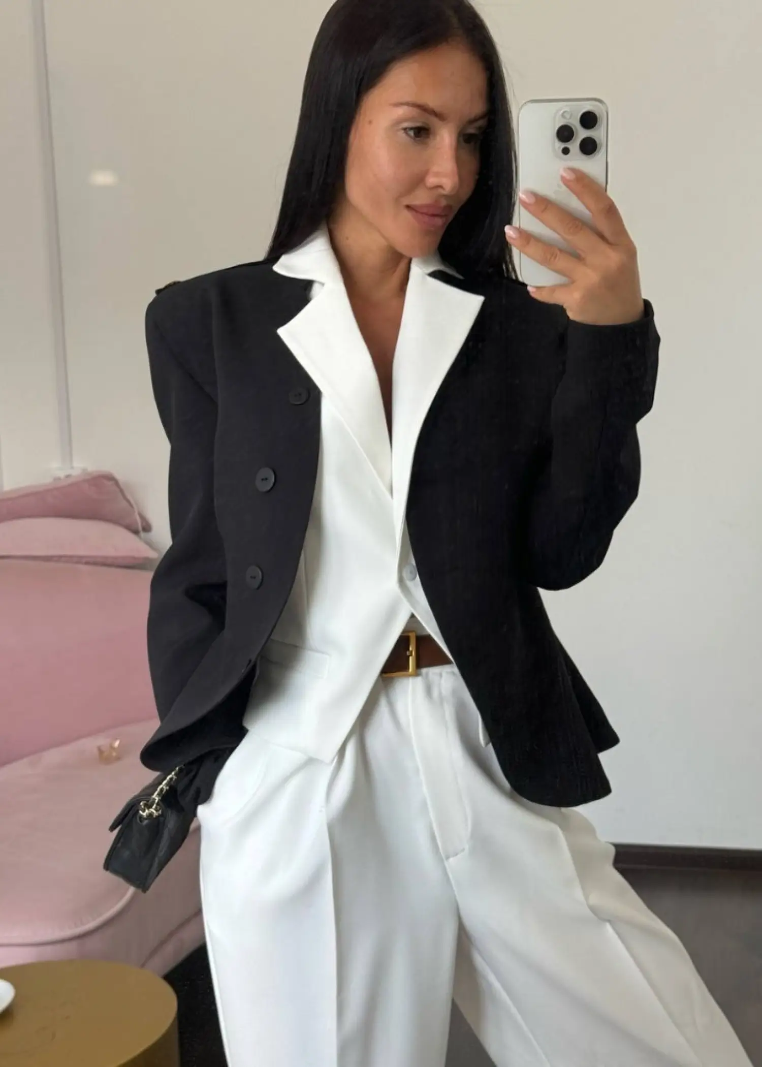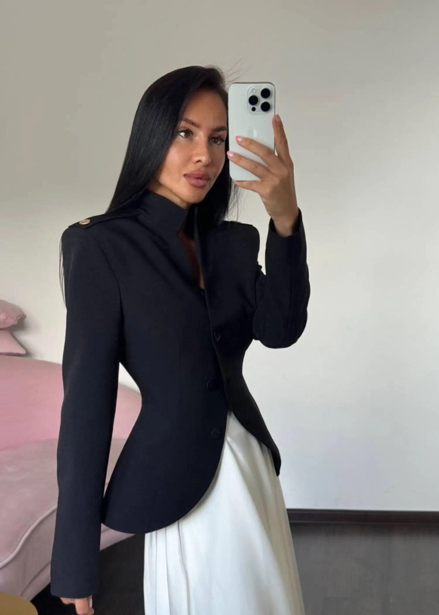 Жакет прилегающего силуэта с погонами, на подкладе с застежкой на четыре петли и четыре пуговицы, с воротником-стойкой и с фигурным оформлением подбортов. Полочка и спинка с рельефными швами, спинка со средним швом, рукава длинные, двухшовные, втачные.