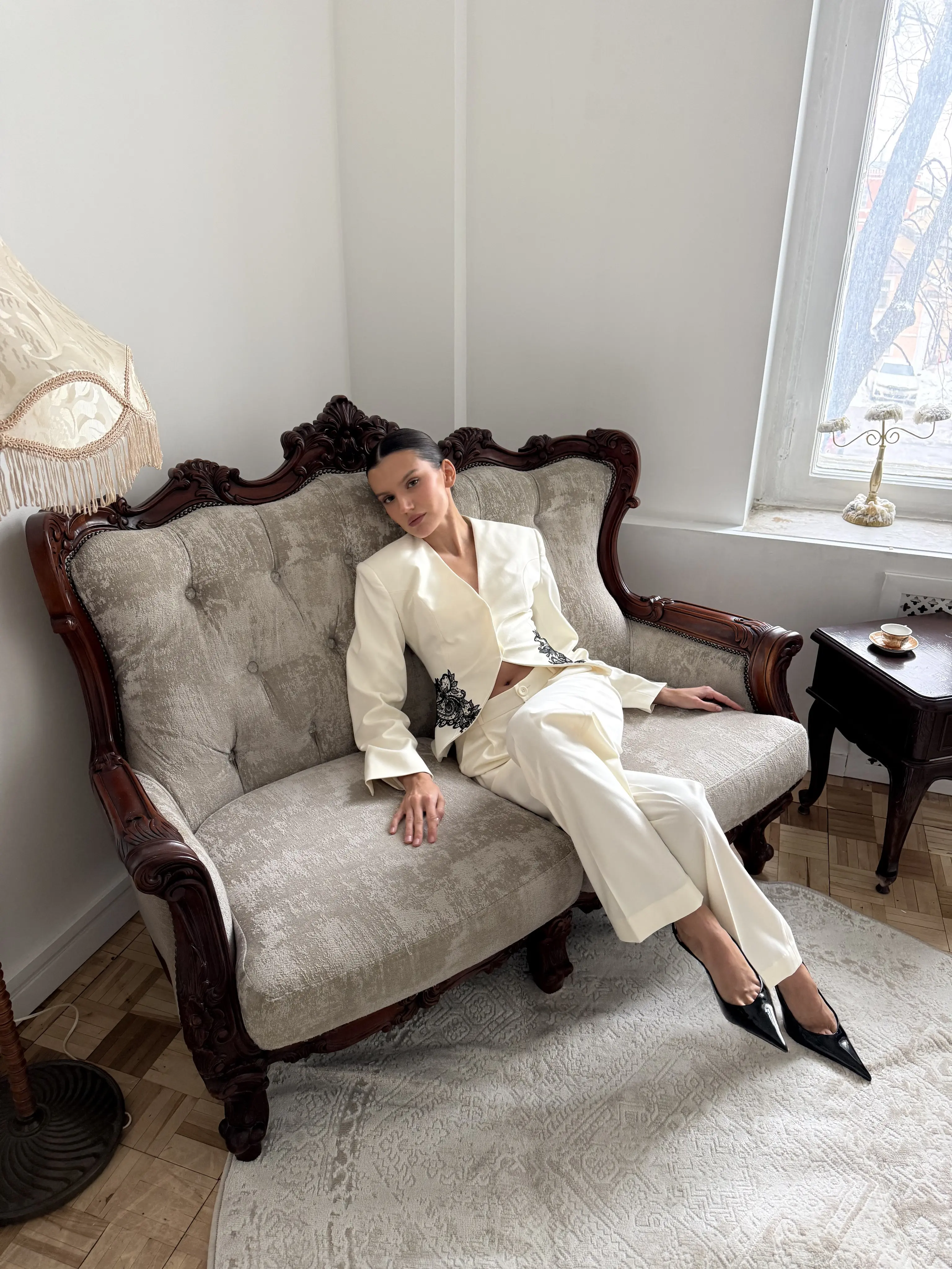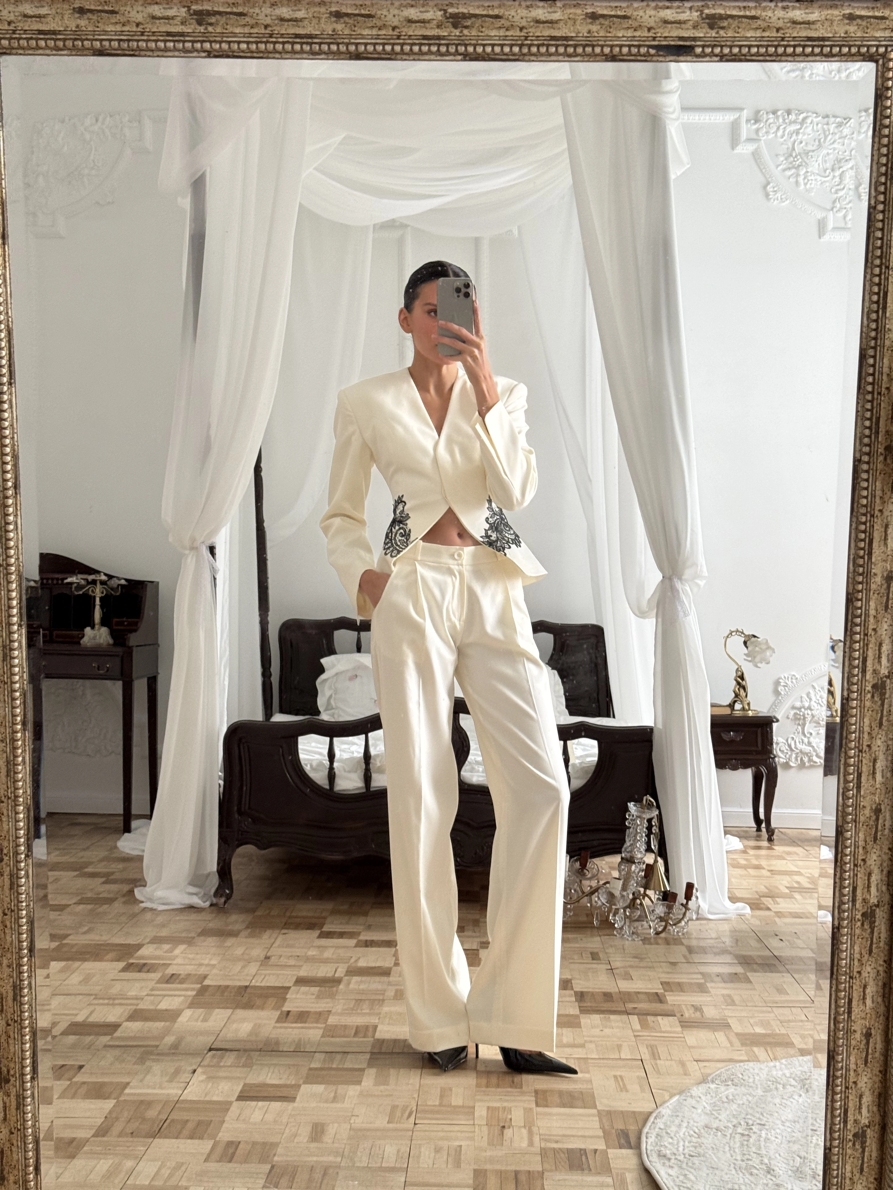 Элегантный жакет, исполненный в классическом белом цвете, станет жемчужиной вашего гардероба. Изящное кружево добавляет утончённости и шарма, делая образ незабываемым.
